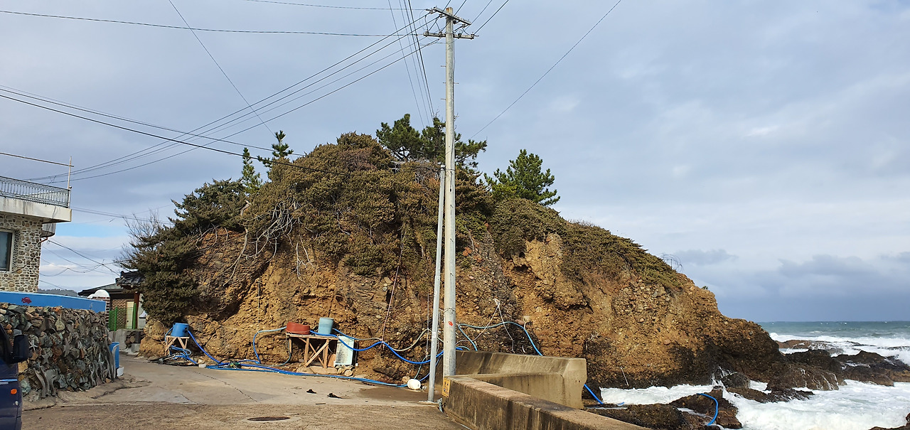 오매향나무가 자라는 바위섬 주변의 제방구멍과 서낭당. 제방구멍으로는 수시로 파도가 밀려 들어오는 것을 볼 수 있다.
