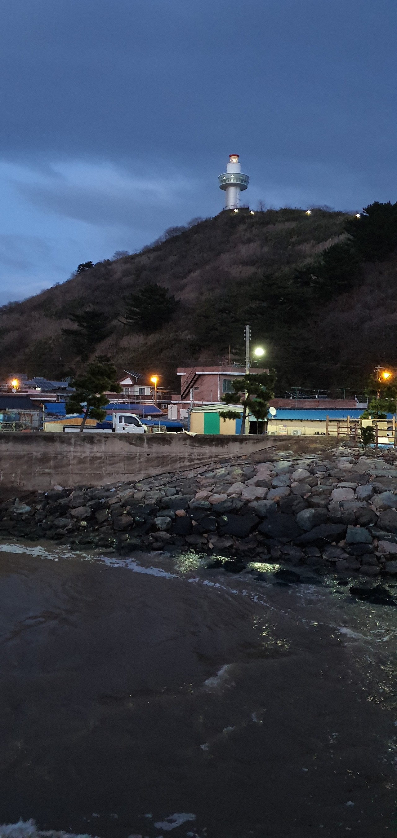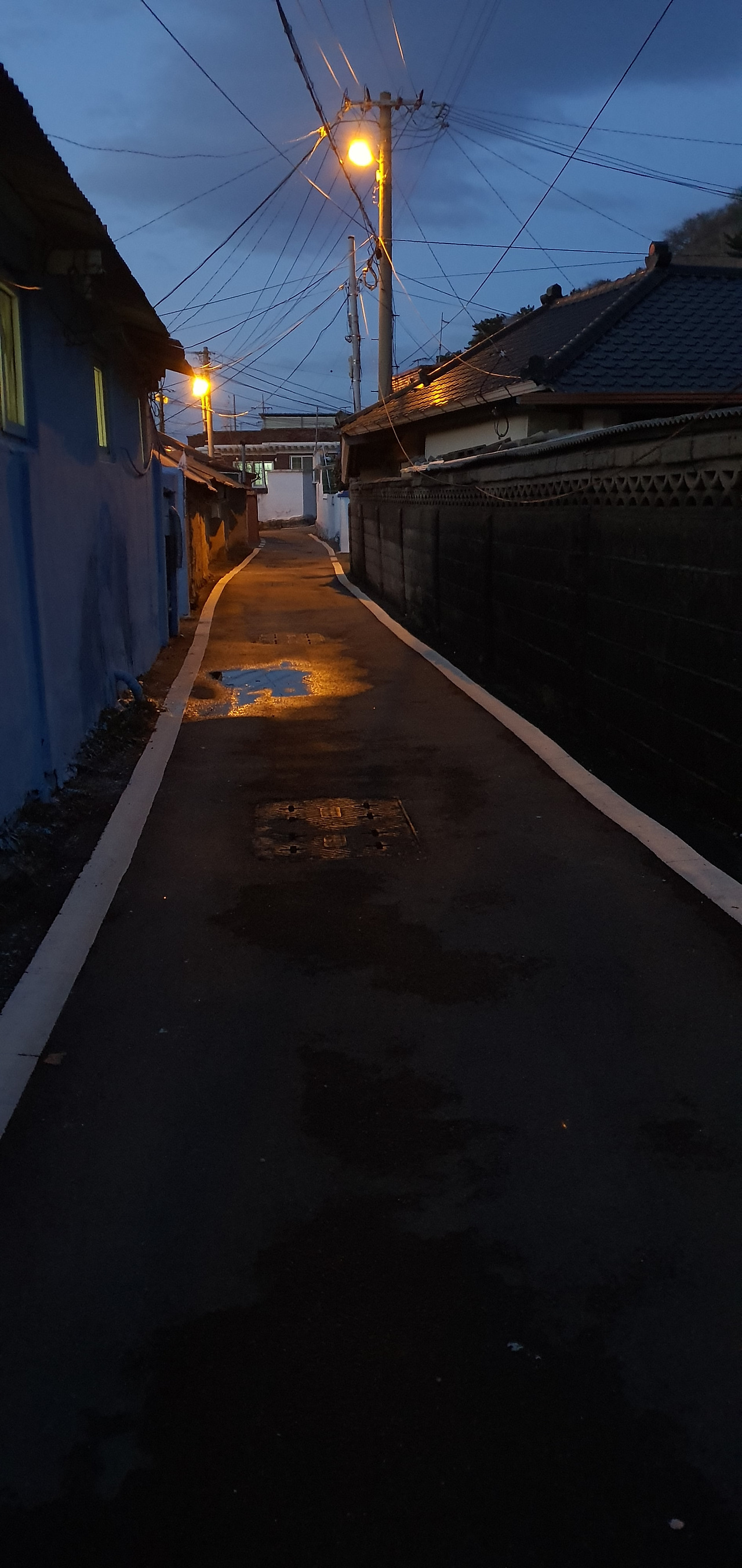 어둠이 내리는 죽도산과 축산천 하구의 바닷가. 골목에 도착했을 때에는 어둠이 몰려온 길을 가로등이 밝혀주고 있다