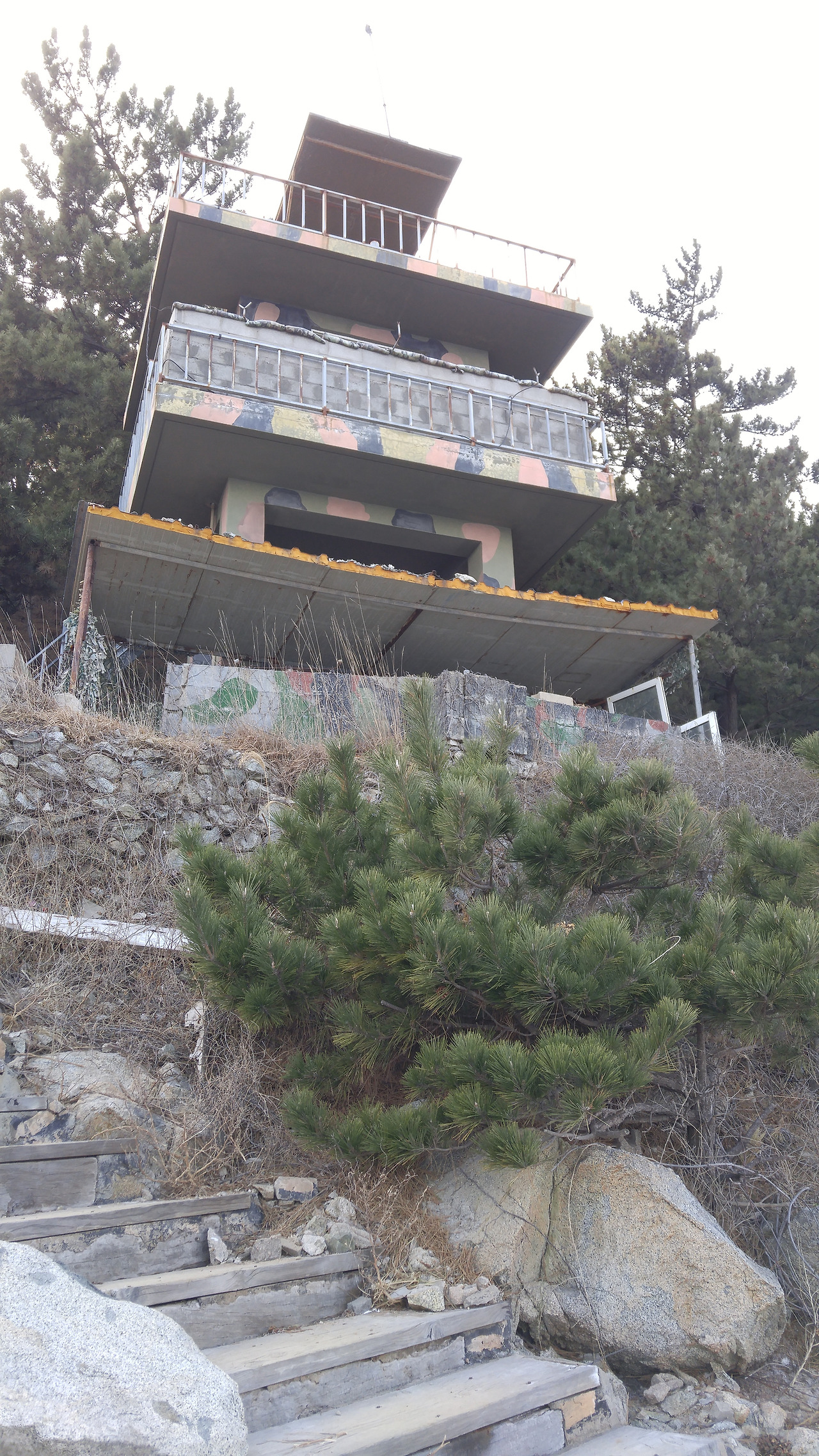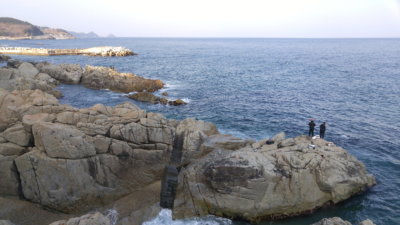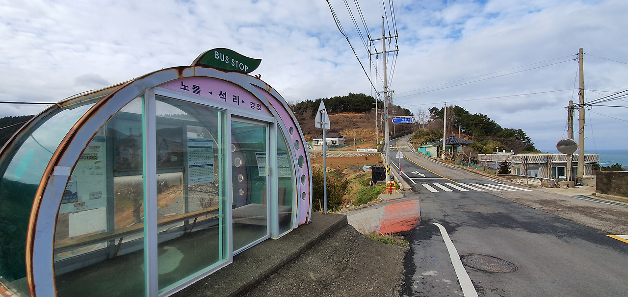 노물리에서 경정항으로 가는 바닷가에 있는 바위들과 군초소, 해안가 바위 위의 해녀상