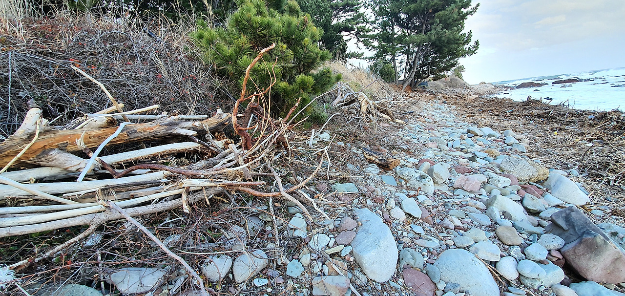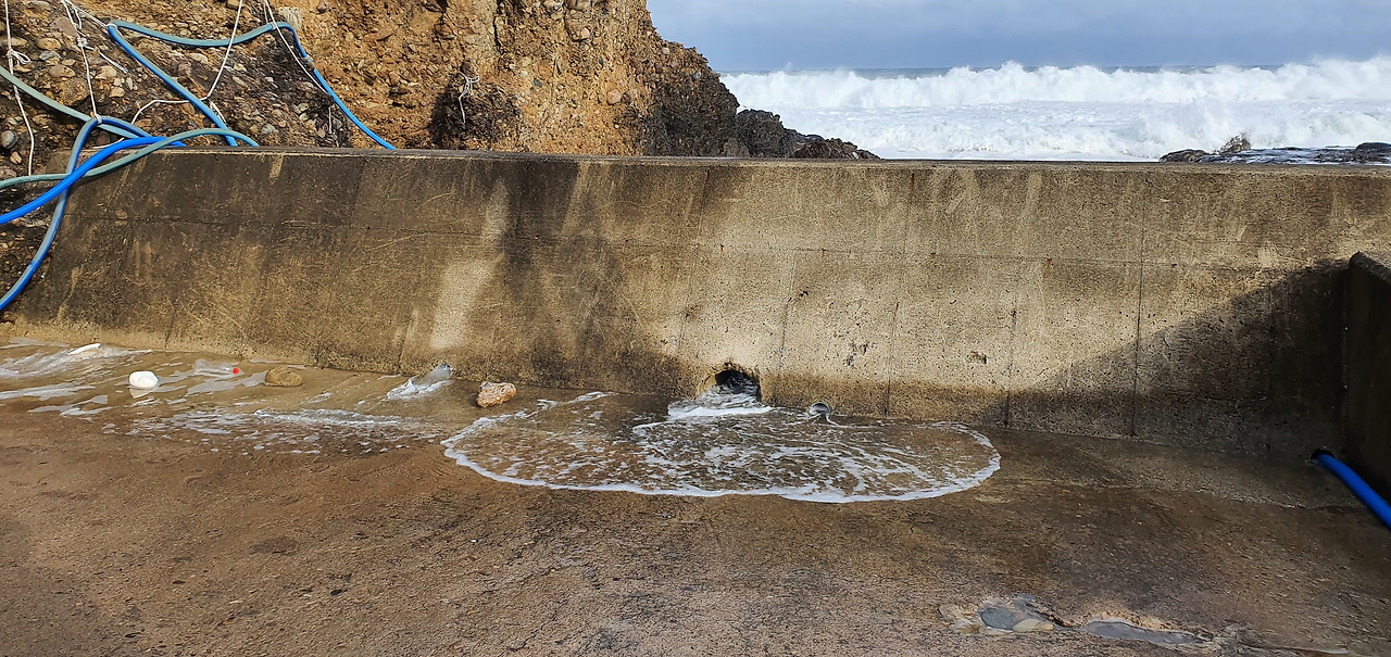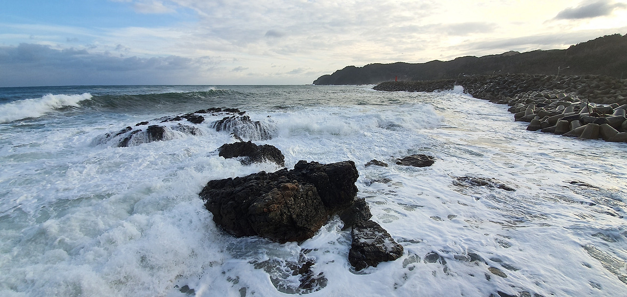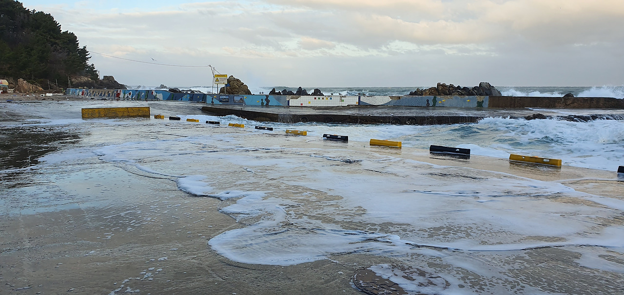 오보리 방파제를 넘어 들어온 바닷물이 해안으로 거칠게 밀려온다. 멀리 오보리 입구의 도로에 잘린 산자락이 보인다