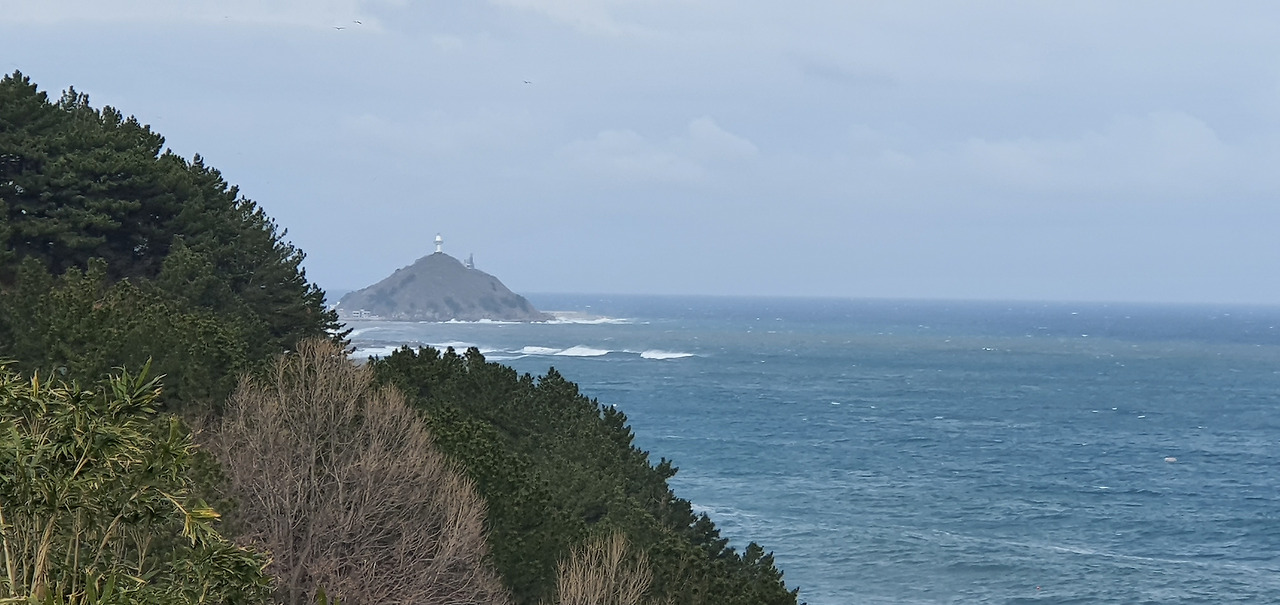 석리마을 입구에서 바라본 풍경, 멀리 축산항의 죽도산이 보인다.