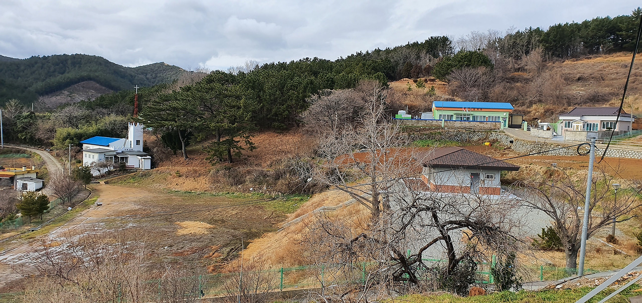 길에서 바라본 대탄리, 멀리 축산항의 죽도산이 보인다