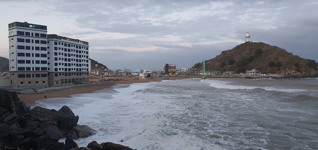 죽도산이 가까워질수록 파도는 점점 거칠어진다. 오늘 하루의 대미를 참으로 격하게 반겨주는 파도들이다. 축산천 하구에는 바닷가 모래밭을 성토하고, 파도가 부딪치는 모래사장에 방파제를 쌓고 리조트를 지었다. 모래밭은 공유수면인데 어떻게 이런 시설을 지을 수 있나 싶다. 그들은 분명히 지번이 있는 토지라고 주장하겠지만 나중에 바다가 어떤 모습을 보여 줄지 두고 봐야 한다. 바다의 경계를 사람이 그을 때 왜곡된 자연이 어떤 식으로 표현될지는 아무도 모르는 일이다. 죽도산을 오르지도 않았는데 어둠이 내린다. 오늘은 아래에서 바라보는 것으로 만족하며 하루의 일정을 접는다. "오늘 저녁은 또 무엇을 먹어야 하나."