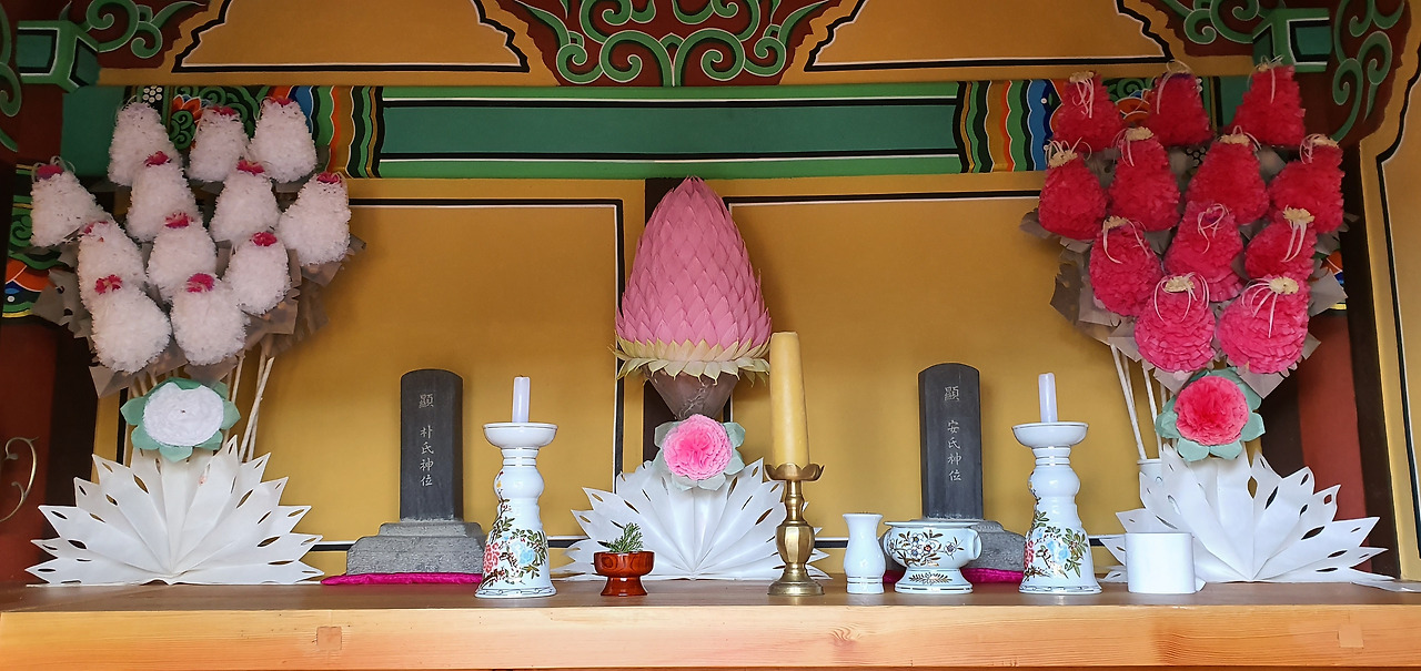 노물리 할매서낭당의 신위와 단을 장식하고 있는 종이꽃들