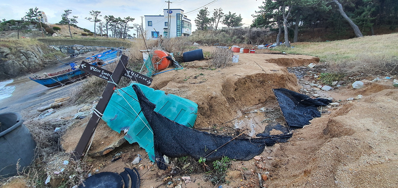 길을 막아 다닐 수 없게 해놓은 모습과 물이 마을 앞까지 밀려오는 모습. 그래도 경정 2리의 해안은 아름답다