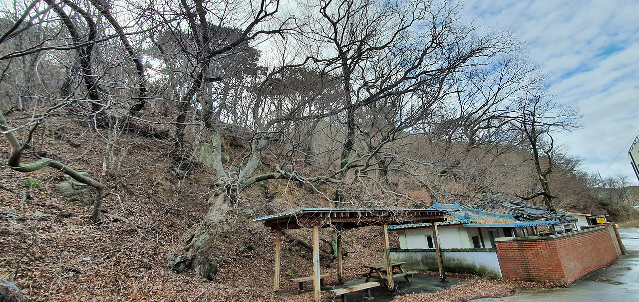 오보리의 서낭당과 서낭당 뒤 사면을 보호하고 있는 느티나무숲