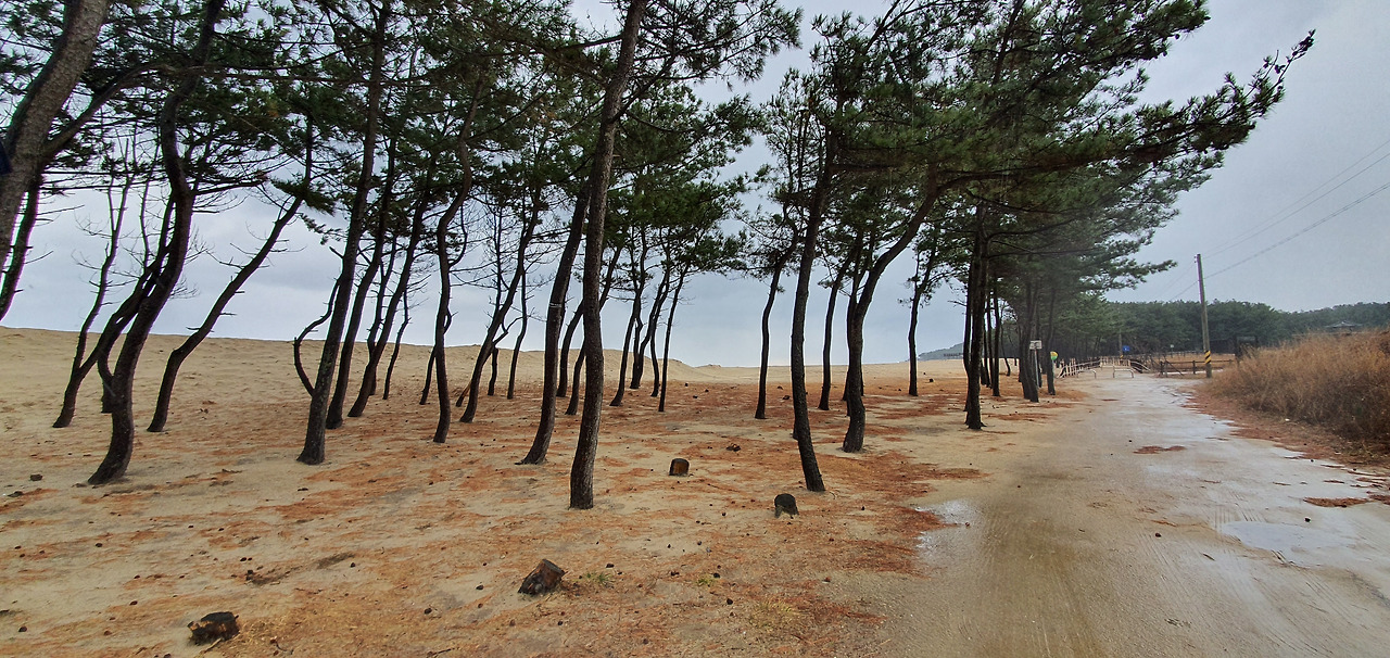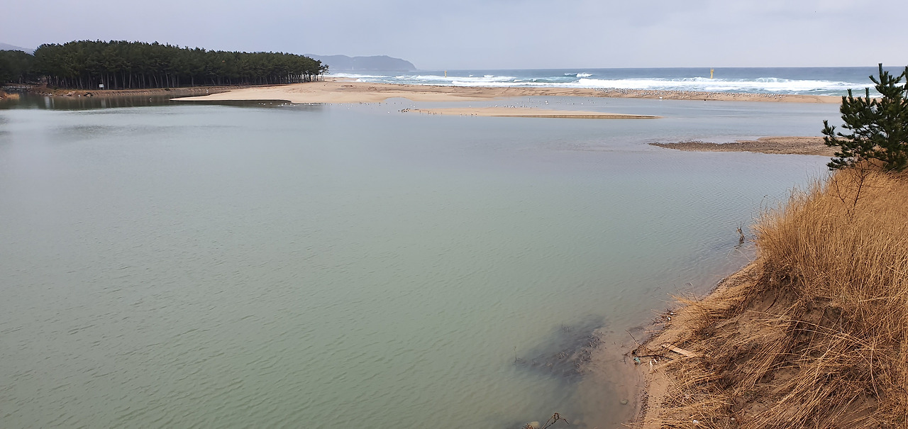 직산리를 지나 평해 남대천 하구의 월송 정교를 건너면 소나무숲이 넓게 펼쳐진다. 이곳은 남대천에서 흘러온 모래들이 넓은 사구를 형성한다. 하구의 크기가 크다 보니, 안쪽에 넓게 물이 고이고 삼각주가 형성되어 있다. 이 삼각주에는 달뿌리풀이 군락을 이루고 있었다. 달뿌리풀은 토양을 잡아 흘러가지 않는 역할을 하는데, 그 때문에 이 삼각주의 식물들은 웬만한 태풍에도 떠내려 가지 않았었다. 그랬는데 2019년에 내린 비가 이 식물들을 모두 쓸어가 버렸다. 그때 사구도 함께 깎여 나갔는데 얼마 지나지 않아 새로운 사구가 만들어졌다. 비를 맞으며 사구를 보고 있는데 물의 상태가 심상치 않더니 어느 순간 작은 물길이 뚫리더니 와르르 사구 한쪽이 무너져 내렸다. 개터짐의 순간이었다. 사실은 넓은 모래사장을 걷고 싶어 사구를 따라 걸으려 했는데 언제 변할지 모르는 바닷가를 내 생각대로 지나가는 게 얼마나 위험한 생각인지를 깨닫는 순간이었다. 자연의 변화하는 순간을 눈으로 목격할 때, 대단한 구경거리를 보는 설렘과 함께 자연의 큰 힘을 느끼는 두려움이 교차한다.