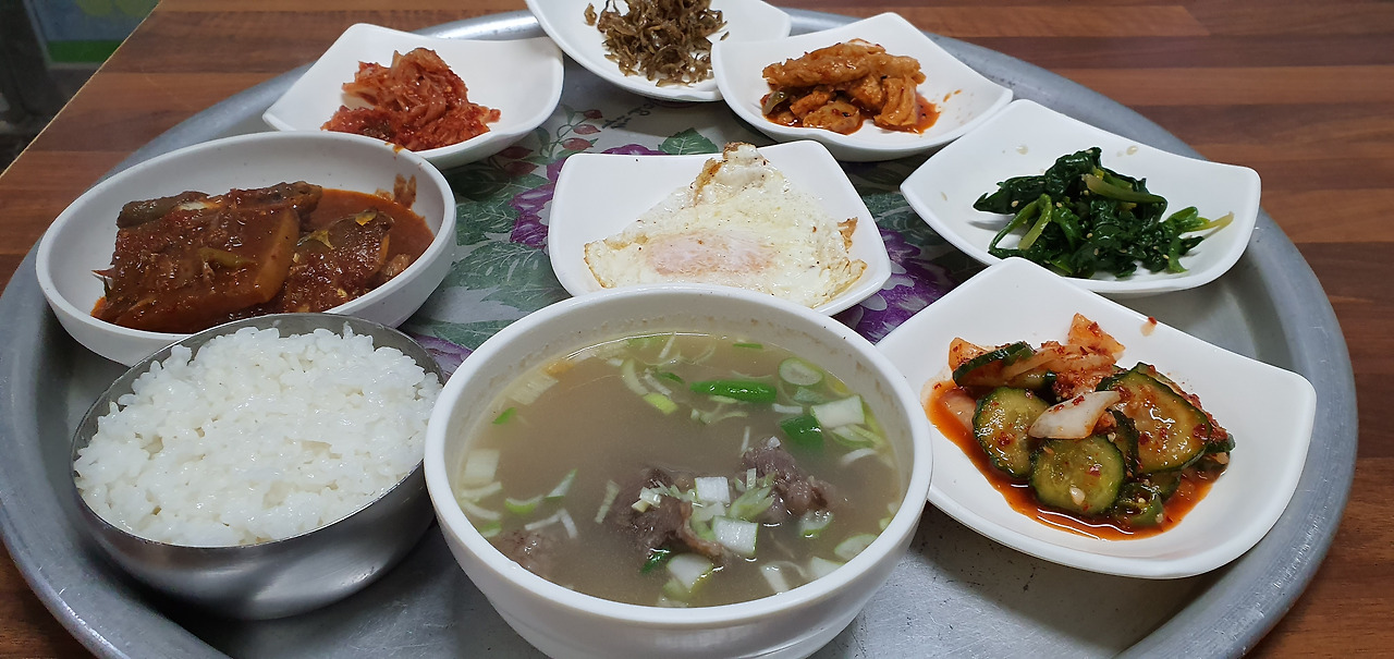 어영부영 길을 걸어 척산천 위 기성교를 건넌다. 이곳에도 비가 많이 왔는지 하천 바닥이 어지럽다. 다리 바로 옆에 있는 카페와 음식점을 겸한 식당에서 곤드레 비빔밤을 주문했다. 가족과 함께 귀촌했다는 주인의 음식 솜씨가 좋다. 만족한 점심을 마치고 도로 옆에 새로 난 인도를 따라 여유를 부리며 걷는다. 이런 때를 함포고복(含哺鼓腹)이라고 하는 건가. 기성 버스정류장이 어느새 저 앞이다.