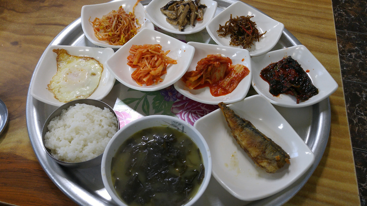 미정식당의 아침 정식, 3년 전이나 지금이나 거의 변하지 않은 모습이다. 반찬이 한 가지 적어지긴 했지만 질은 다르지 않다.