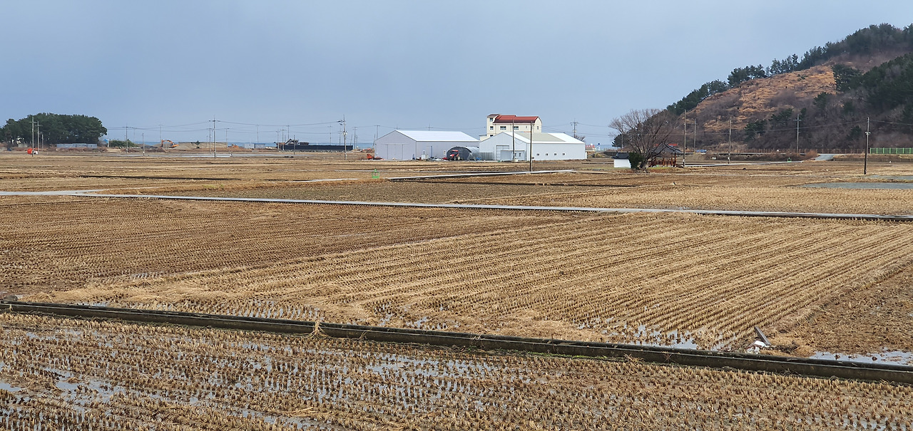 기성면의 너른 들녁, 저쪽 논 한가운데 서낭당이 있다. 새로 포장된 길을 걸어 기성터미널에 도착한다.
