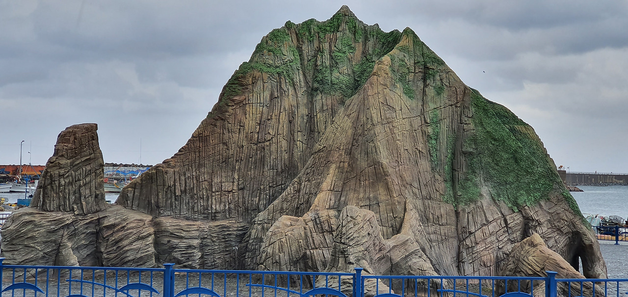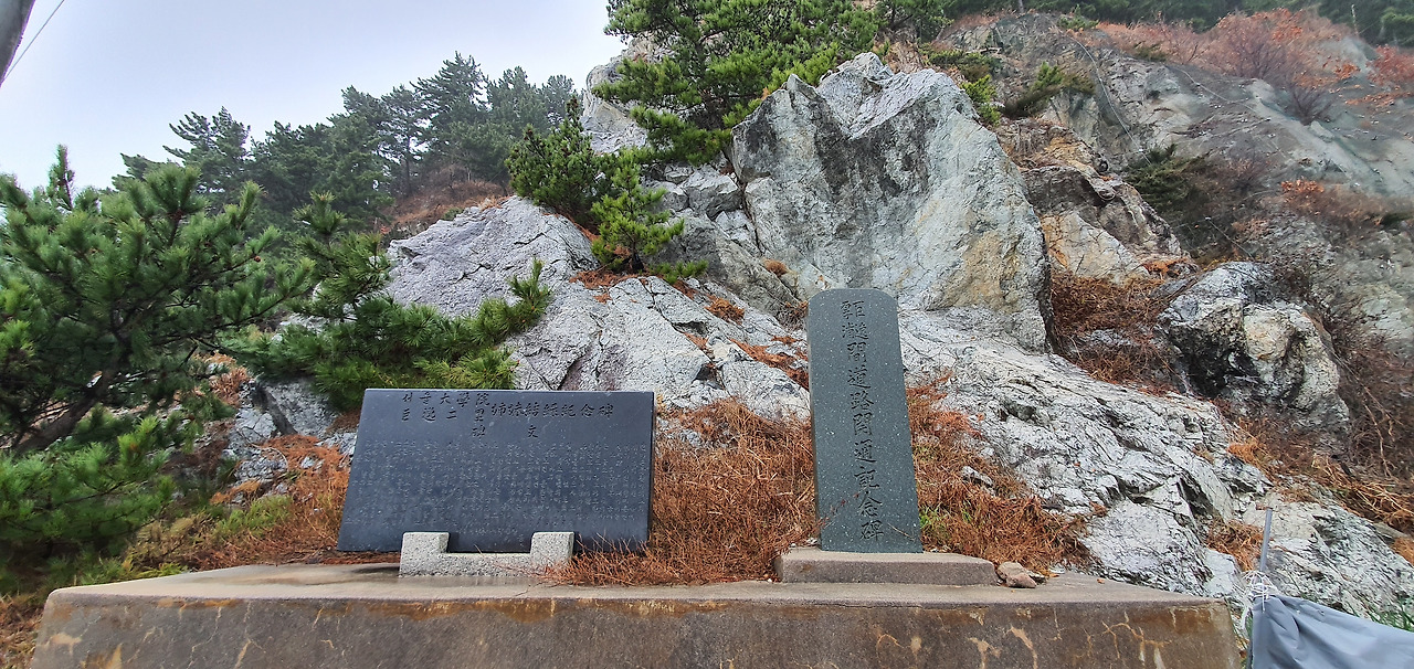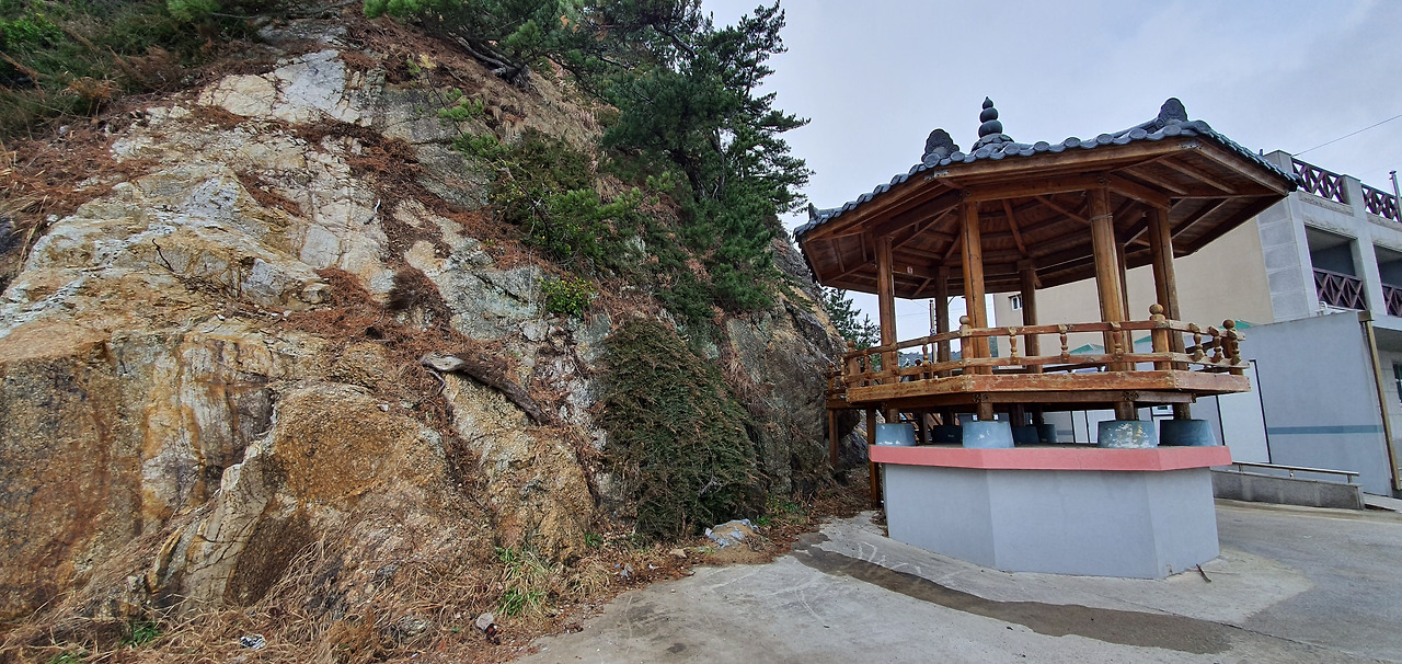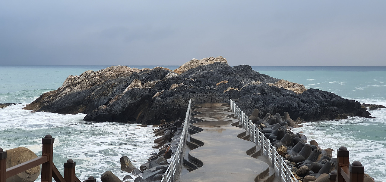 아침을 먹고 길을 나서는데 비가 내린다. 정말 비가 많은 겨울이다. 눈보다 비가 내리는 것이 덜 춥다는 뜻이긴 한데, 걷기 여행자에게 비는 그리 달가운 것이 아니다. 비옷은 갑갑해서 우산을 들고 다니는데 한 손이 우산에 묶여버린다는 단점이 있다. 휴대폰으로 사진을 찍을 때도 부담스럽고, 시야를 가로막아 걷기도 수월치 않다. 하여튼 비가 올 때는 무언가 하나를 포기하든지 아니면 시간을 끌게 된다. 원래 코스가 후포리 골목을 지나 신석기 유적관을 보고 내려와야 하나 선창을 따라 바닷가를 걷는다. 비가 와 계단이 미끄럽기도 하고, 이전에 걸을 때 아침 일찍 올라갔다 신석기유적관이 문을 안 열어 그냥 내려왔던 기억이 있다. 등기산 공원의 망사정으로 오르는 길은 바위 사면에 데크계단을 설치해 놓았는데 계단이 차지하는 규모가 너무 커 주변 경관을 해치고 있다. 우리나라의 유명 관광지치고 과도한 시설을 하지 않은 곳이 얼마나 될까. 자연과 경관을 보전하기 위해 안전시설도 최소한의 것 이상은 하지 않는 외국의 관광지들을 볼 때마다 우리를 되돌아보게 된다. 편리함보다는 불편해도 원래의 자연을 보전하며 관광하는 것에 대해 깊이 생각해봐야 한다. 갓바위 옆에는 후포 스카이워크 조성작업이 한창이다. 이른 시간이라 갓바위를 들어가지는 못하고 멀리서 바라본다. '갓바위에 소원을 빌면 잘 들어준다는데.' 해파랑길에서의 무사를 빌며 발길을 옮긴다.