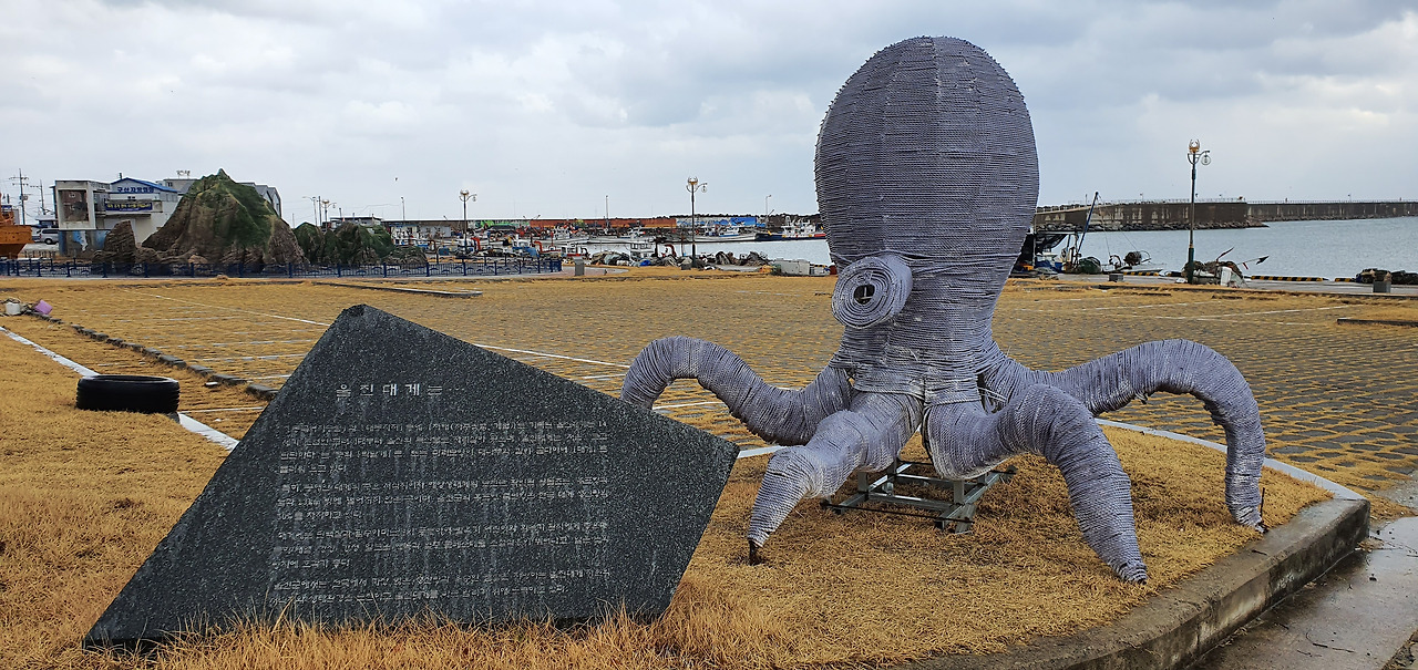구산 해변의 나지막한 소나무들, 곰솔숲을 걷는다. 소나무 가지에 걸리는 바람이 귓속을 간질이듯 지나간다. 구산 2리 마을회관 앞 버스정류장에 앉아 싸온 사브레 한 봉지를 뜯어먹는다. 버스도 사람도 지나가지 않는다. 구멍 난 양말이 밑천을 드러낸다. '걷는 습관이 이상한 건지, 그만큼 많이 걸은 건지.' 구산항에는 울진대게를 홍보하는 커다란 문어와 독도가 있다. "울릉도 옆 그 독도?"라고 묻는다면 "그렇다." 구산항에는 과거 울릉도와 독도를 2-3년에 한 번씩 순찰하며 관리한 수토사들이 출항하기 전 묵던 대풍헌이 있기 때문에 이곳에 독도 모형을 만들어 놓은 것이다. 구한말 우리나라의 국력이 약했을 때 러시아는 울릉도의 목재를 수탈해 갔고, 일제는 독도의 강치를 멸종시켰다. 대풍헌과 함께 전시공간인 울진 수토문화전시관에서 잠시 쉬어간다. 지금도 독도를 빼앗으려 혈안이 되어 있는 외세를 누르려면 힘을 키워야 한다.