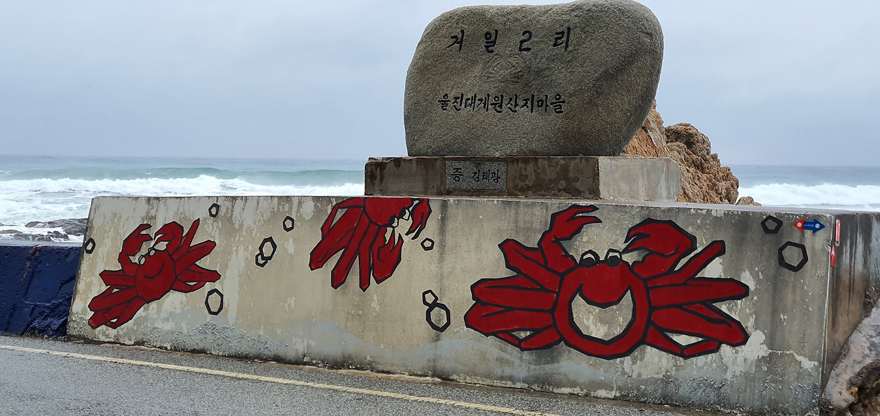 평해 광업의 수송용 컨베어벨트가 있는 방파제를 지나면서 모래 해변이 계속 이어진다. 거일 2리에는 울진대게 원산지 마을이라는 표석을 길가 제방에 세워 놓았다. 대게의 서식지가 이곳에만 있는 것은 아니지만 대게로 유명해진 강구를 의식한 것은 아닌가 싶다. 후포항에서 23km 정도 떨어진 곳에 왕돌초라는 수중 암초군이 있는데 이곳에 대게가 많이 서식한다고 한다. 거일 2리의 입구에는 1973년에 세운 '서울대학원 자매결연 비'가 눈길을 끈다. 새마을 운동을 하면서 서울대학교 대학원과 거일 2리가 자매결연을 맺은 내용을 적은 비인데, 벌써 50년이 다 되어간다. 돌비는 오랜 시간을 인내해 자신의 기록을 후세에 충실히 전달한다. 그래서 묘비명에 집착하는 사람들도 있다지. '나는, 비보다는 그냥 건강히 오래 살면 땡큐일 뿐이다.' 이 마을에는 대게와 대나무 조각상을 함께 세운 황금대게 평해 공원이 있는데, 공원에서 잠시 쉬어가는 이라면 만나게 되는 치어 방류 안내판이 있다. 치어를 방류해서는 안 되는 금지 대상에 대해 적어 놓은 것인데, 어류 전장이 10cm 이상인 것, 눈이 없는 쪽에 흑색 반문의 면적이 10% 이상인 넙치, 강도다리, 가자미류 종묘, 육종 등으로 개발된 신품종 종묘, 다른 종간 잡종 된 종묘, 척추뼈가 휘었거나 꼬리지느러미가 뒤틀려 있는 등의 기형 어류 등이다. 방지가 금지된 것들은 대부분 바다 생태계를 교란할 우려가 있거나, 바다에 서식하는 어류의 유전형질에 영향을 미칠 것을 우려한 조치로 보인다. 그런데 요즘은 너무도 많은 종류의 어류를 들여오거나 양식하고 있으므로, 바다의 생태계를 고려해 방생이 가능한 어종을 선정해 제시한다면 더 낫지 않을까.