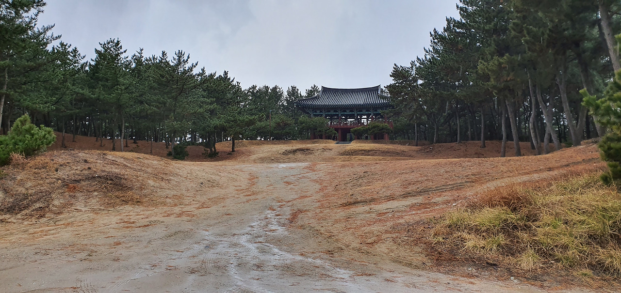 사구습지를 지나 소나무숲을 걸으면 숲의 탁 트인 부분이 나오고 그 안쪽 언덕에 정자가 하나 보인다. 월송정(越松亭)이다. 그런데 일반적으로 생각하면 달이 보이는 소나무숲 이라는 뜻일 것 같은 월송정이 달 월(月) 자를 쓰지 않고 넘을 월(越) 자를 쓴다. 그 이유는 신라의 화랑인 영랑, 안상랑, 술랑, 남석앙이 이곳을 지나가다 소나무숲의 아름다운 모습을 보지 못하고 지나쳤다고 해서 붙여진 이름이기 때문이다. 월나라에서 소나무를 가져와 그렇게 붙여졌다는 설도 있다는데 이건 아닌 것 같다. 소나무가 우리나라에 자생하고 있으며, 특히 사구에서 살아남을 확률이 높은 소나무인 곰솔이 이 일대에 많이 자생하고 있었을 것이기 때문이다. 조림은 기념식수처럼 간단한 일이 아니다. 화랑들도 돌아올 때는 이 숲에 들렀을 것이다. 언제고 시간을 내 월송정에서 바다 위로 뜨는 달을 맞이해 달빛에 취하고 싶다. 월송정 숲을 따라 이전에는 평해황씨시조의 제단원을 들렀었는데 이제는 황보천 하구에 보행교가 설치되어 돌아가지 않는다. 그래도 아름드리 소나무들이 우거진 제단원의 길은 걸을만한 가치가 있다. 이곳의 경치 때문에 드라마나 영화 촬영도 자주 있는 곳이다.