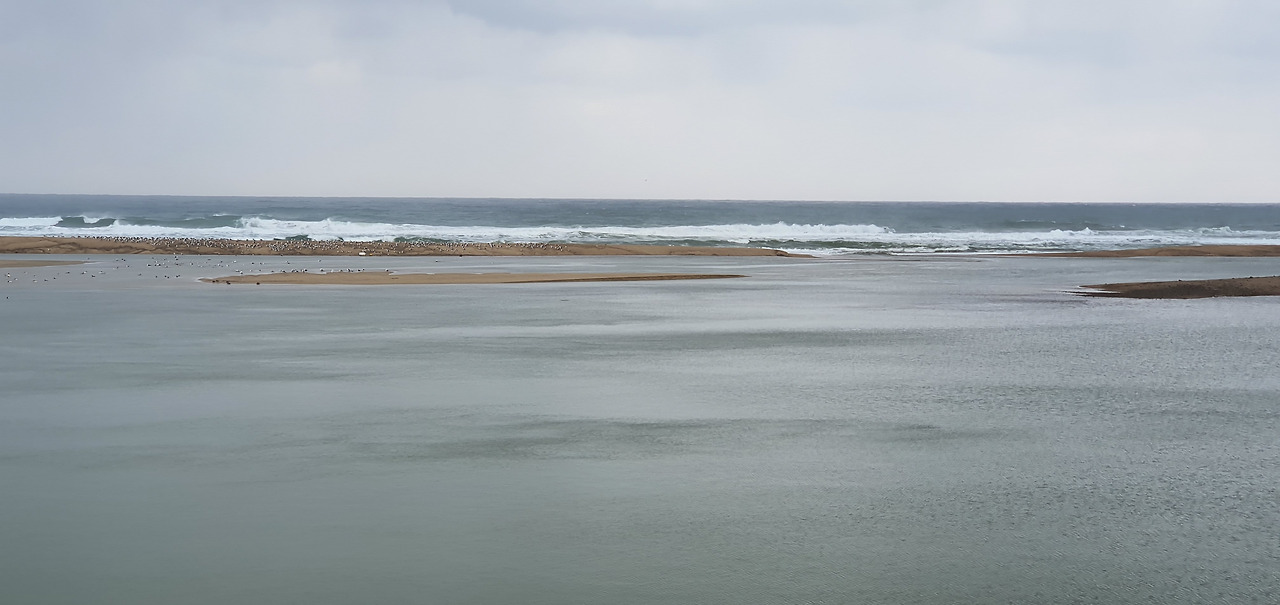 평해남대천하구의 개터짐이 일어나는 현장. 사주의 한쪽이 무너지고 바닷물과 민물이 만나는 순간이다
