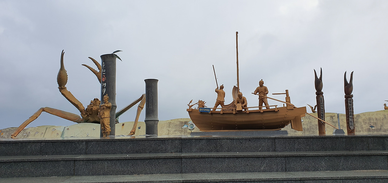 대게의 원산지임을 알리는 표지석, 대게 공원의 대나무 조형물과 대게를 잡는 어부상은 이 지역의 주요 생산물이 무엇인지 금방 알게 해준다