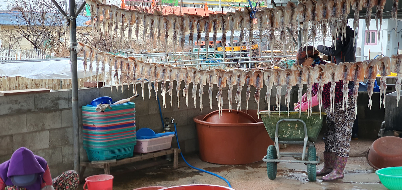 이 마을의 한 집에서는 오징어를 말리고 있었다. 쏟아지는 비 속에서도 소소한 일상은 계속된다