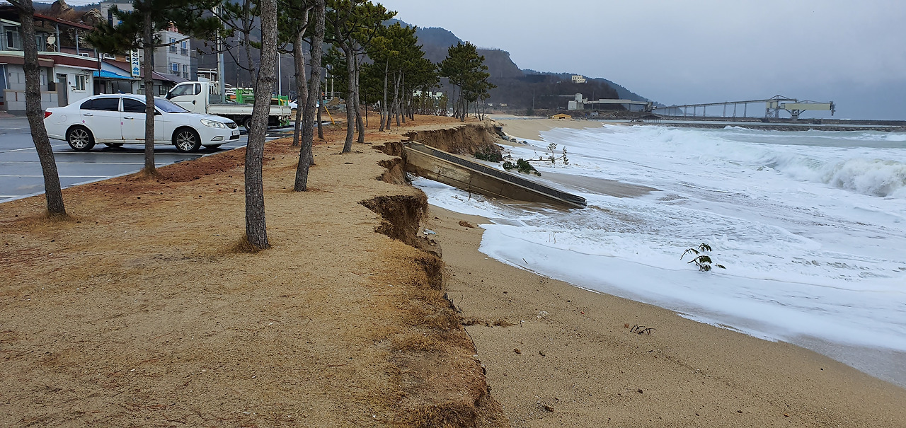해안의 소나무숲 가장자리의 모래가 무너져 내리고 지중 시설물이 드러난다