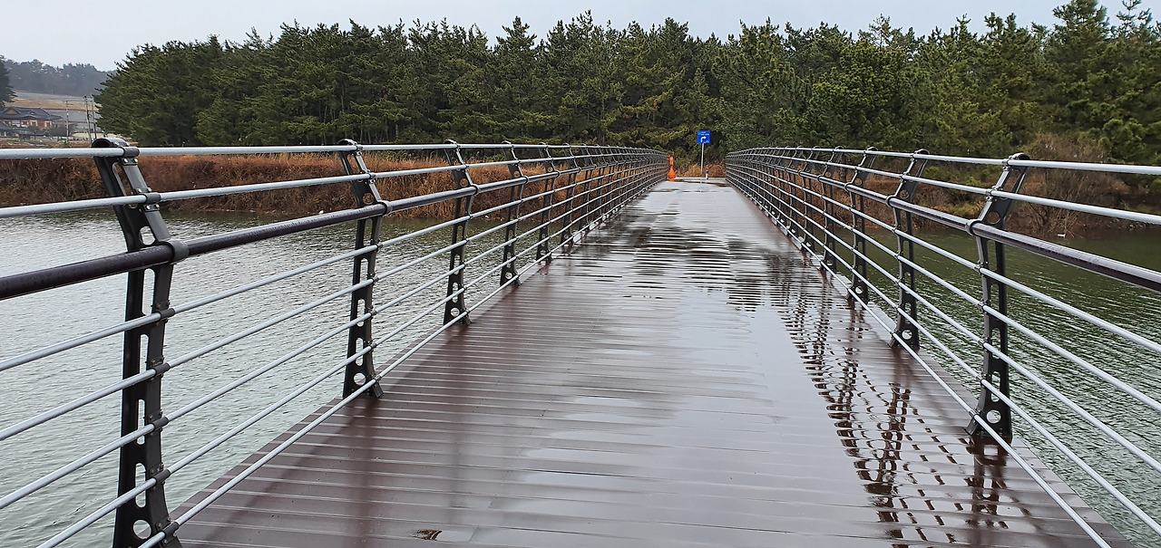 월송리의 소나무숲길은 침묵하지 않는다. 이른 아침과 낮이면 새들이 숲을 울리고, 저녁과 밤이면 바람이 숲을 돌아다니며, 잠 못 이루는 소나무 가지들에게 장난을 건다. 낚시와 캠핑 온 사람들의 목소리가 숲을 가로지르기도 하고, 그들이 떠난 뒤에는 멀리 경운기 소리와 작업용 트럭들이 바삐 이동하는 소리가 숲을 찾는다. 해파랑길은 소나무숲을 가로질러 평해사구습지 옆을 따라간다. 평해사구습지의 물은 남대천하구에서 끌어온 것이고 사구습지도 인위적으로 조성해 준 것이다. 습지에는 데크를 설치해 사구습지를 감상할 수 있도록 해놓았다. 사구습지의 모습이 너무 인위적으로 꾸며져 생태적인 기능보다는 경관에만 신경을 쓴 것 같아 아쉽다. 하지만 이 덕분에 옆에 있는 갈대가 우거진 사구습지가 함께 보호될 수 있으니 얼마나 다행인가.