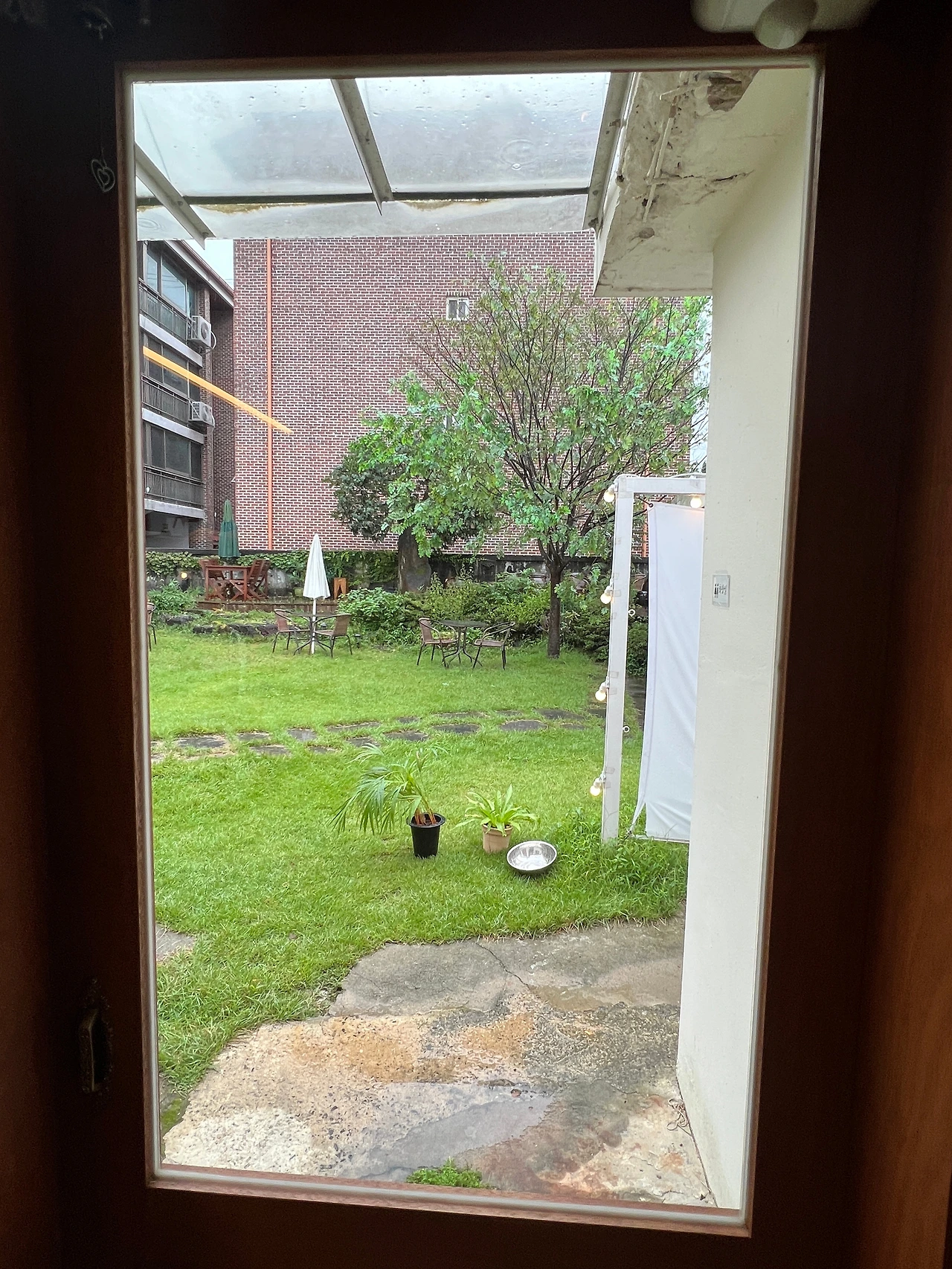 초록 잔디 위 접힌 파라솔을 지나