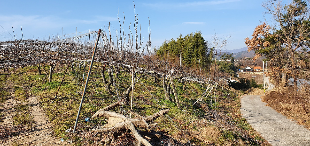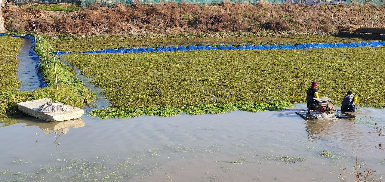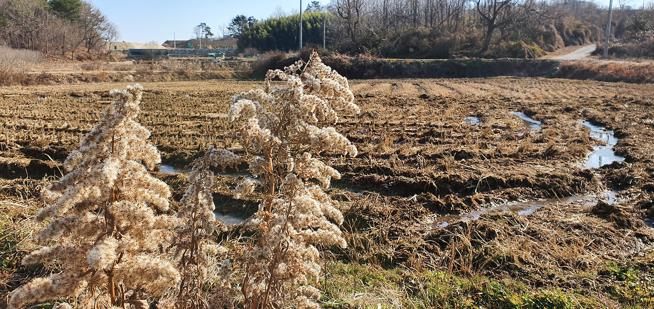 한겨울 미나리꽝에서 미나리 수확에 열중하고 있는 두 사람 길가에서 만난 배나무 과수원(좌). 물이 조금씩 차있는 논 가에는 햇살이 따뜻하다(우).