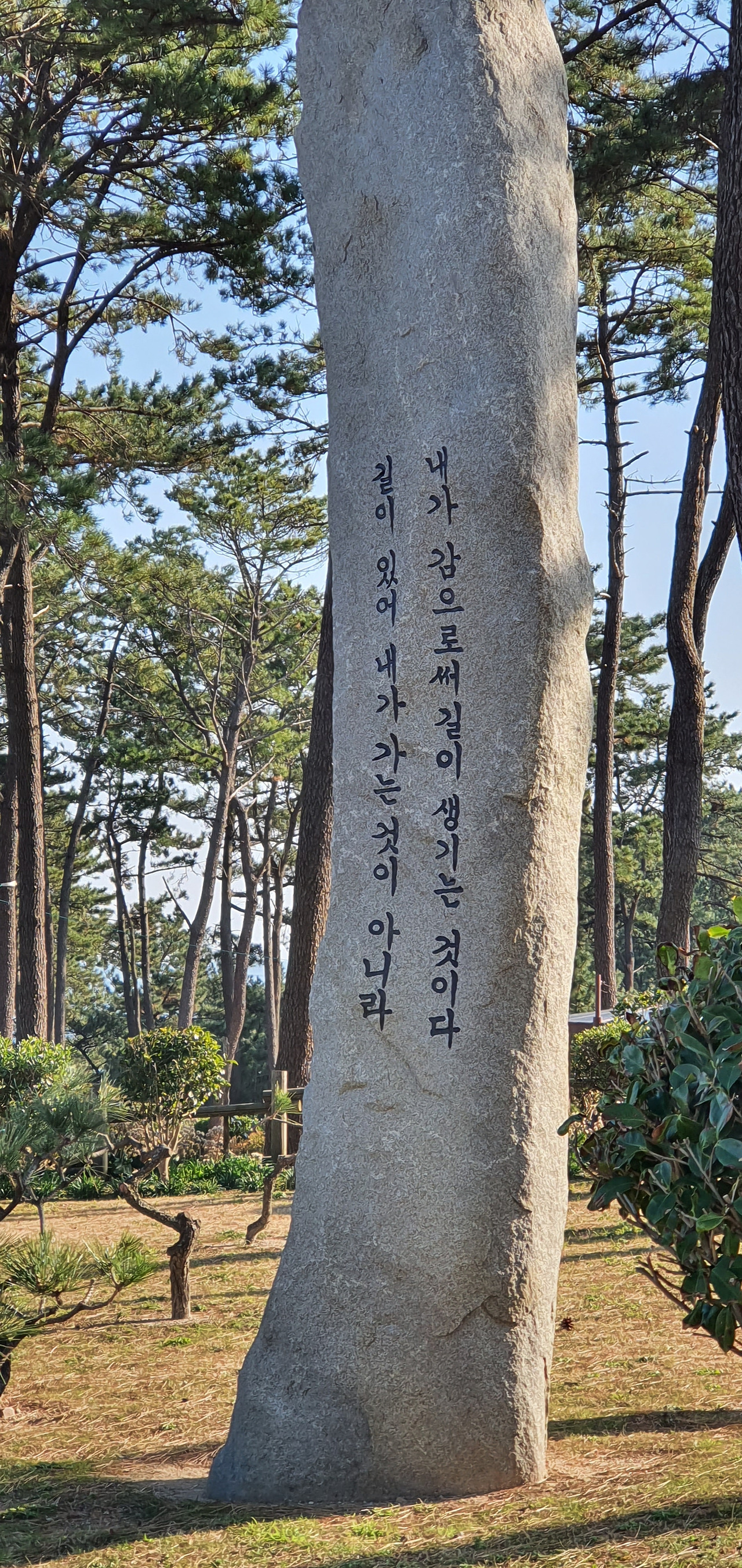 바다를 바라보는 송정공원에서 화장실에 들렀다. 누군가 의자에 앉아 색소폰을 부는데 절로 따라 흥얼거리게 한다. 바람구멍인지 세로로 내놓은 화장실 창 틈으로 곰솔 숲이 보이고, 그 사이로 소리가 들리고 있었다. '명퇴하고 여유가 있는 분인가?' 화장실을 나와 공원을 걷는데 공원에 세워 놓은 기념돌의 글귀가 눈에 들어온다. " 길이 있어 내가 가는 것이 아니라 내가 감으로써 길이 생기는 것이다. " '그래, 나도 동감이다. 이제 다시 간다.'
