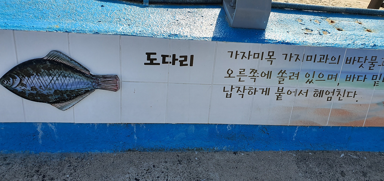 툴툴 자리를 털고 길을 걷는데 개 한 마리가 따라온다. 혼자 걷다 보면 이런 일이 종종 있다. 길에서 나에게 관심을 가져주는 대상이 있다는 건 고마운 일이다. 가지고 있던 사탕을 하나 까서 주었다. 그런데 개한테 사탕을 줘도 되는 건가? 쫄래쫄래 나의 꽁무니를 따라오기도 하고 또, 자기가 먼저 길을 안내하기도 하던 이름 모를 개는 나사 해변으로 들어서자 어디론가 가버린다. 나사 해변에서는 물고기 이름 공부를 벽화를 통해 할 수 있다. 기념사진을 찍도록 만들어진 등대 앞에 서니 갑자기 배가 고파진다. '12시가 넘었는데 점심을 어떻게 해야 하나.' 어디서고 밥 먹을 데가 눈에 띄지 않는다. 청조수퍼 언덕에 있는 서낭당도 볼 겸 옆골목으로 빠져 걸어간다. 바다 마을의 뒷골목은 대부분 폭이 좁고 지붕보다 높은 경우가 많은데 그 덕분에 바다를 보는데도 문제가 없다. 마을의 앞바다에는 양식시설이 가득 들어차 있다. '굴인가? 전복인가? 아니면 가리비?' 뭐든 상관없다. 해돋이 카페 근처에서 물질하는 해녀들의 숨비소리가 허공을 가른다. "오늘 참 날이 좋긴 좋은가보다."