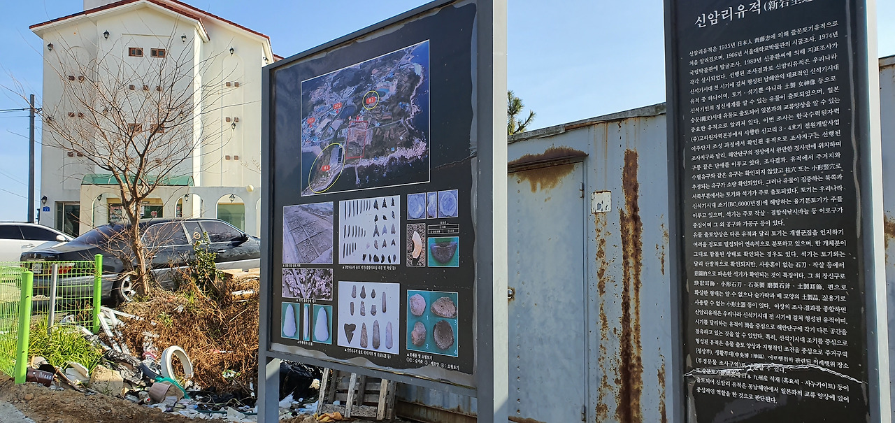 성게의 알을 까고 있는 해녀 할머니들 바닷가 주택단지 앞에 신암리 유적지를 표시하는 안내판이 세워져 있다. 이 일대에서 1935년 줄문토기가 출토된 이후, 1966년, 1974년, 1989년에 조사가 이루어져 흙으로 만든 여신상을 비롯해 토기, 석기 등 다양한 신석기시대의 유물이 출토되었다. 안내판이 세워진 자리는 신고리 원전 3.4호기 전원개발사업 이주단지를 조성하면서 융기문토기와 작살, 낚싯바늘 등이 출토된 곳이다. 유물이나 유적지를 보면 정신을 온통 빼앗기는 성격 때문에 이런 안내판만 나오면 이동이 어렵다. 벌써 여러 번 찾아온 이곳이지만 한참을 안내판 앞에 서 지저분하게 쓰레기가 버려진 안내판 주변을 보다 보니 유적 출토지에 18채의 멋진 집을 지으면서 수천 년의 역사를 품었던 기억을 이렇게 박대해도 되나 싶어 진다. '나도 참 아무데나 끼려 하는 이 병을 어찌할까.'