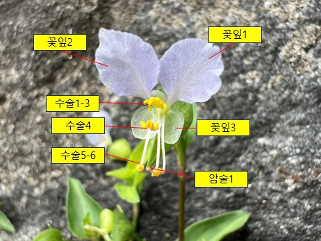 닭의장풀을 보면 쉽게 닭의 모습이 떠오릅니다. 닭의장풀의 꽃은 3장의 꽃잎에 6개의 수술과 1개의 암술을 가지고 있습니다. 2장의 꽃잎은 짙은 푸른빛이 돌거나 연한 보랏빛을 띠고, 아래쪽에 꽃받침처럼 생긴 꽃잎 한 장은 희거나 투명한 빛을 띠고 있습니다. 6개의 수술은 위쪽의 3개와 중간의 1개는 수정을 해줄 곤충을 유도하는 헛수술이고 아래쪽 암술 옆의 두 개가 꽃가루가 있는 수술입니다. 예쁜 모습과 독특한 꽃의 구조 때문에 식물해설을 하는 분들이 우선적으로 찾아보는 식물이기도 합니다. 요즘엔 이식물의 약성과 나물로서 먹었을 때의 맛을 소개하는 분들도 많습니다. 최근엔 닭의장풀로 와인을 담그는 동영상을 보기도 했습니다.