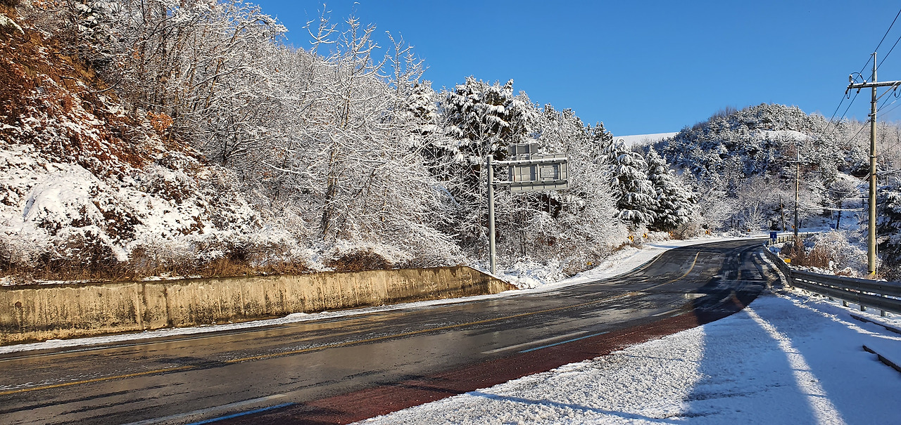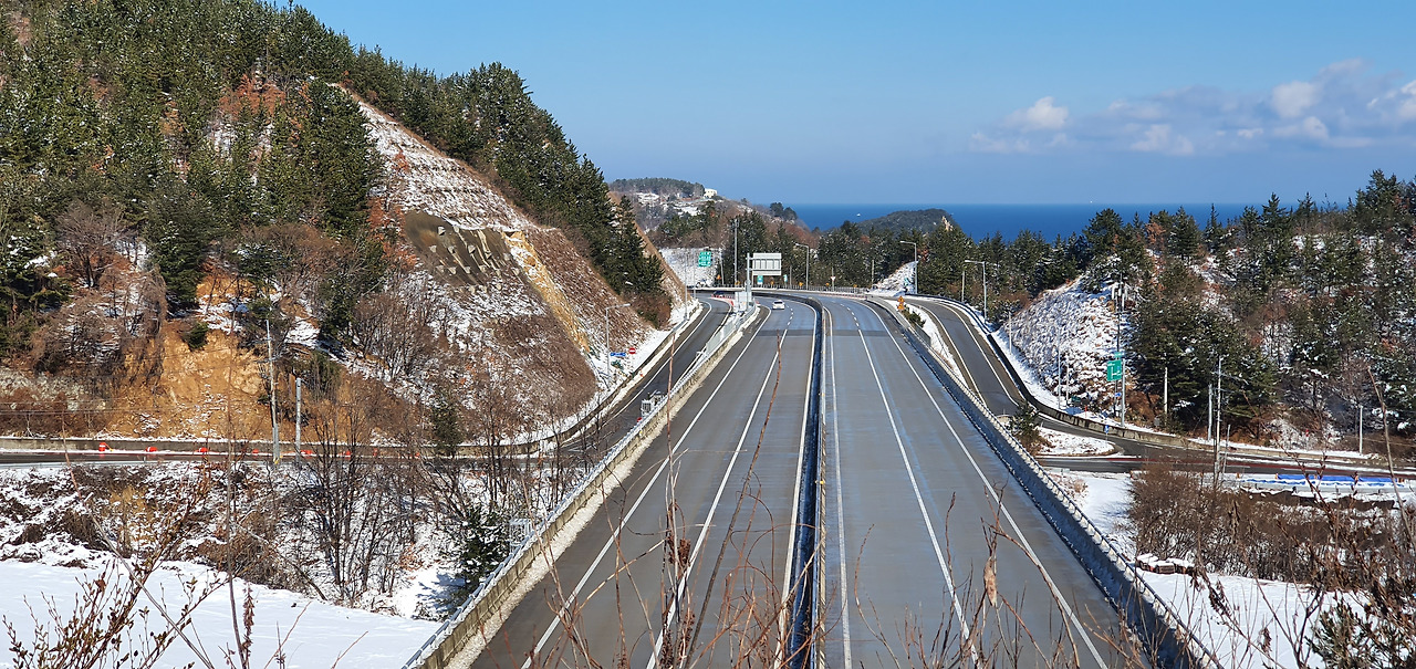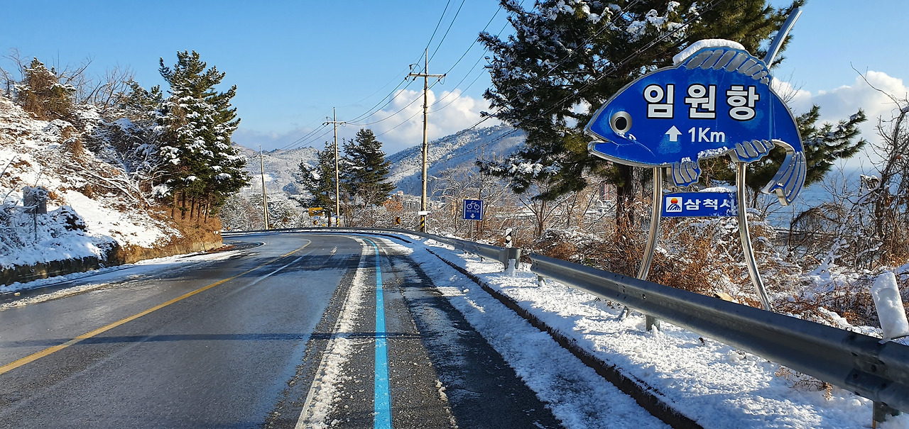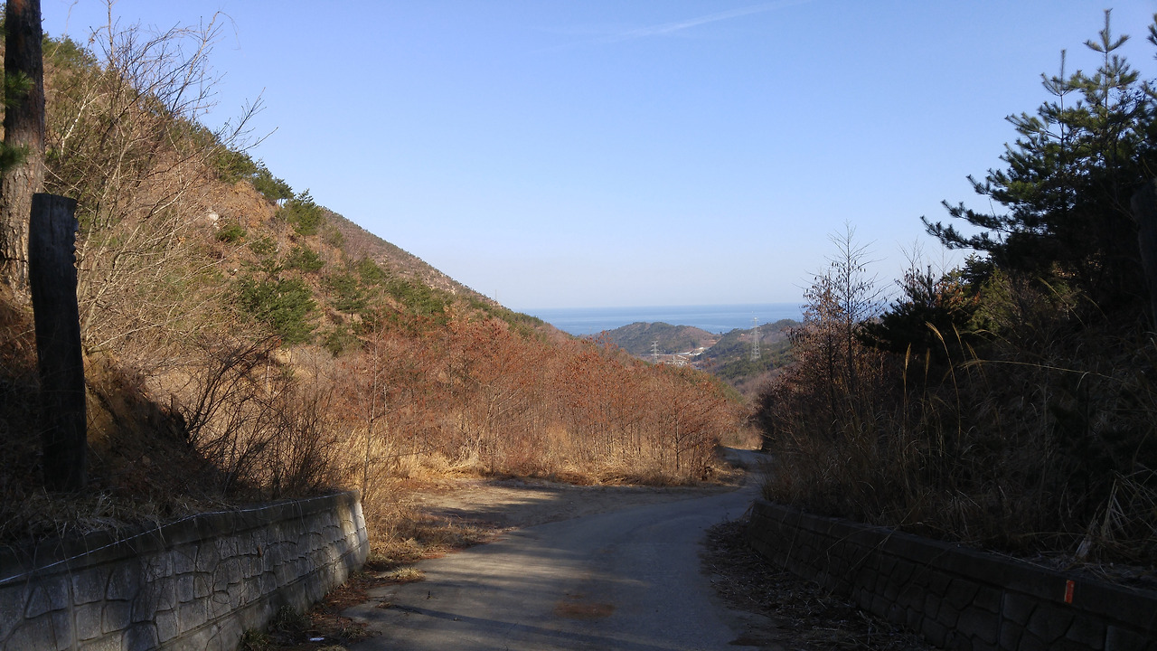 옥원 삼거리 입구에서 옥천리 맹두골쪽으로 들어가지 않고 길곡천을 따라 난 도로를 따라간다. 이쪽은 인도가 설치되어 있거나 동해안 자전거길이 조성되어 있어 비교적 안전하다. 두 길은 곧 다시 만난다. 이 구간은 바닷가에 넓게 자리 잡은 한국 남부발전으로 인해 해안을 접근할 수 없어 우회도로를 따라가는 것이어서 특별히 눈에 띄는 역사나 문화자원도 없고, 도로를 따라 걷다 보니 안전에도 신경이 쓰이는 길이다. 그래도 어쩌랴 해파랑길에 이런 구간이 한두 곳이 아니니 참고 가는 수밖에 없다. 문제는 해파랑길에 산업단지, 호텔, 공적기관 같은 자연을 훼손하는 시설들이 계속 늘어나고 있다는 것이다. 한국 남부발전의 입구가 있는 언덕길을 걸을 때쯤 아침 햇볕이 비치면서 소나무 가지에 쌓인 눈들이 쏟아져 내리기 시작했다. 눈이 비처럼 쏟아져 내리다니, 즐거움과 감동은 멋진 경관에서만 찾을 수 있는 건 아니다. 그 순간을 찾아내고 즐길 줄 아는 이들에게만 혜택으로 찾아오는 것이다.