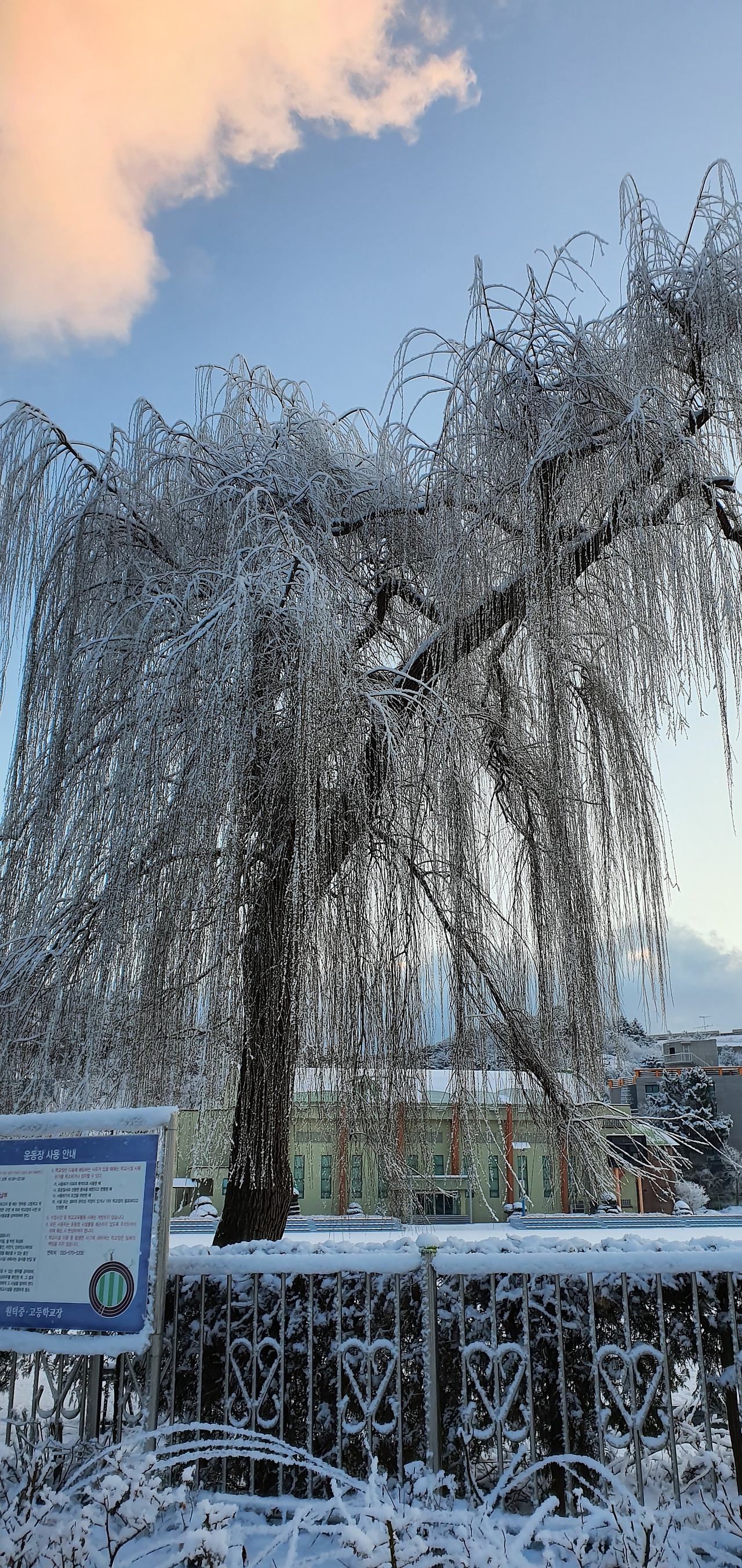 거리는 녹았지만 인도는 꽁꽁 얼어붙어 걷기가 힘든 길을 따라 걷는다. 그 와중에도 원덕고등학교 교문 옆의 능수버들은 짙은 화장을 한 듯 눈으로 치장하고 있다.