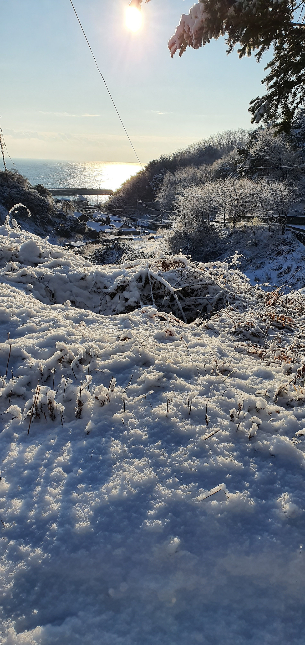 바다와 노곡항이 눈 내린 배경으로 더 아름답게 보인다.