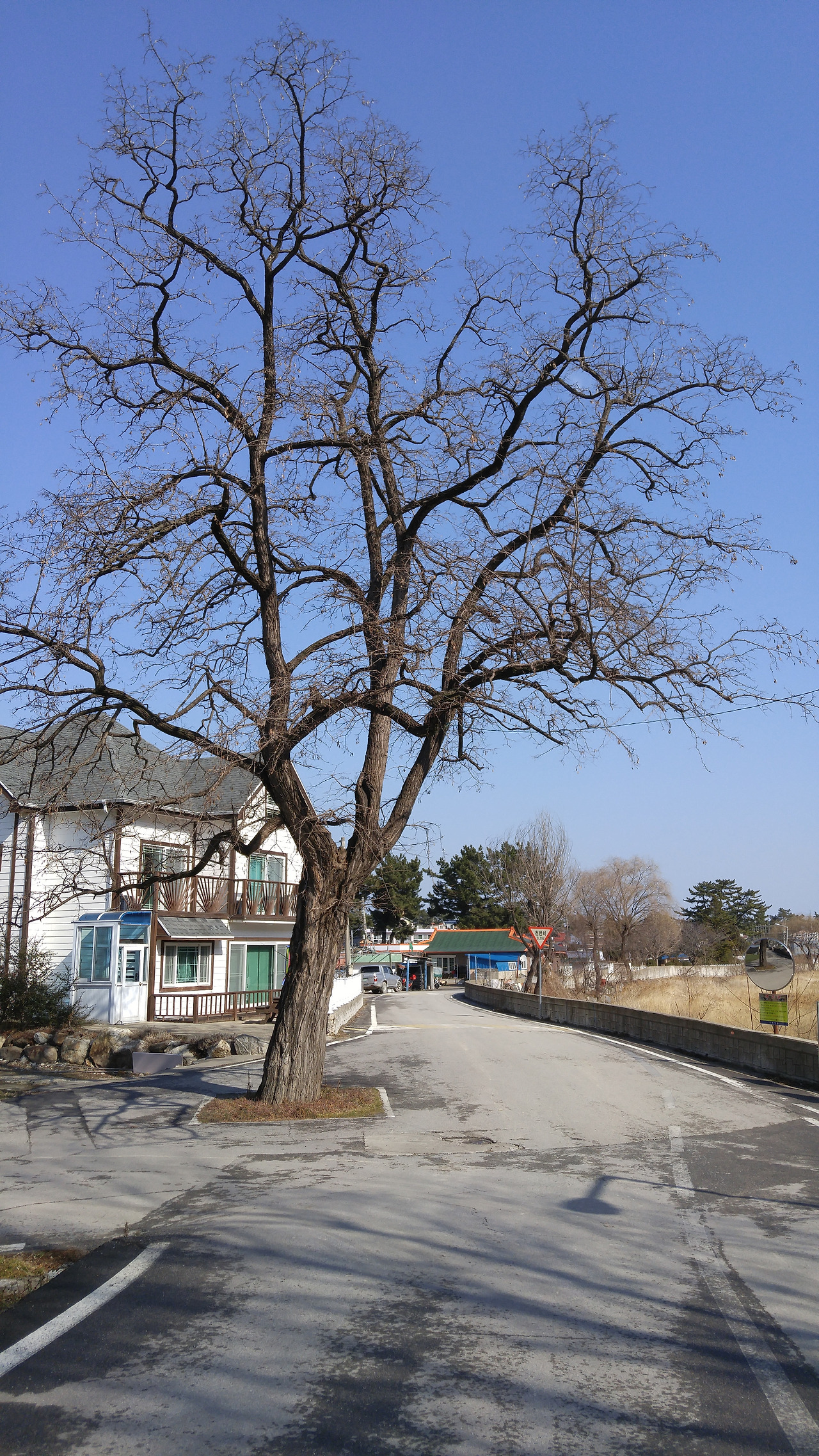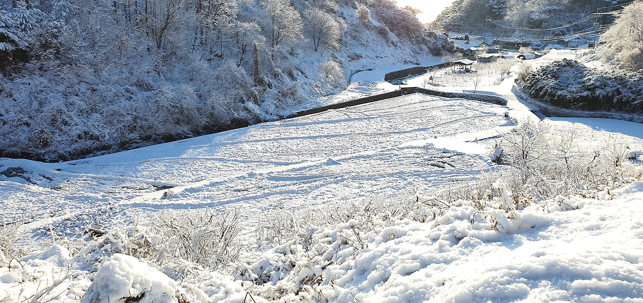 부은 눈으로 거리를 나서니 어제 내린 눈이 쌓인 거리는 빙판이 되어 걷기가 힘들었다. 등산화가 아닌 워킹화는 이런 빙판길에서 전혀 힘을 쓰지 못한다. 미끄러운 마을 길을 따라 천천히 걷는다. 호산감리교회의 안마당은 나뭇가지에 쌓인 눈으로 꽃밭이 만들어졌다. 이럴 때면 나도 마당 있는 집이 부럽다. 풍경은 좋았지만 문을 연 식당이 눈에 안 띄어 그냥 마을을 떠나 걸어야 했다. 차들이 다닌 자리는 눈이 녹았지만 도로의 가장자리나 인도는 아직 눈이 쌓여있어 미끄러워 걷기가 힘들었다. 걷는 걸음의 숫자만큼이나 앞을 내다보는 횟수가 늘어났다.