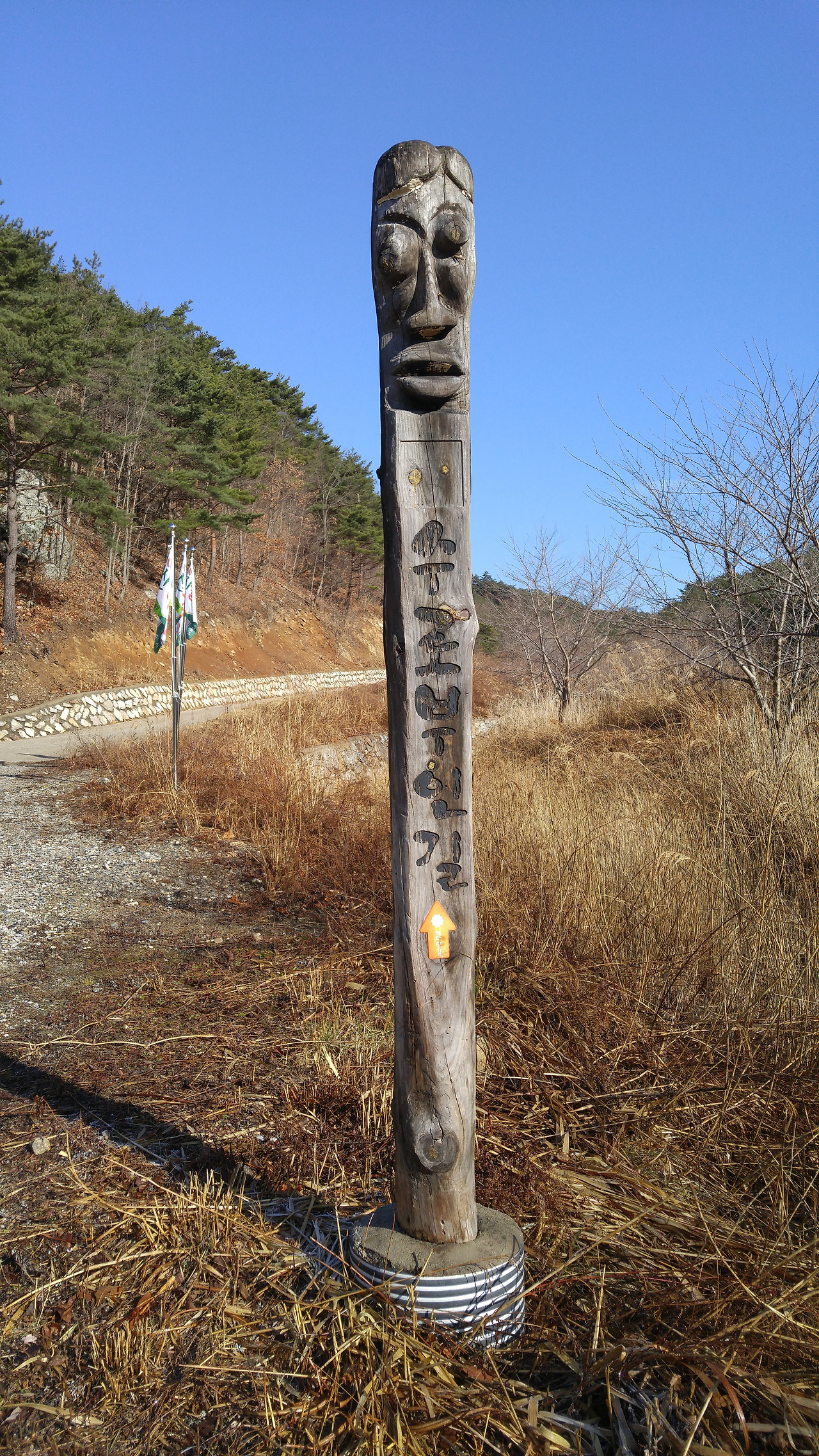 해파랑길 29코스의 산길에서 만날 수 있는 길가의 소규모 논과 수로부인길을 안내해주는 장승