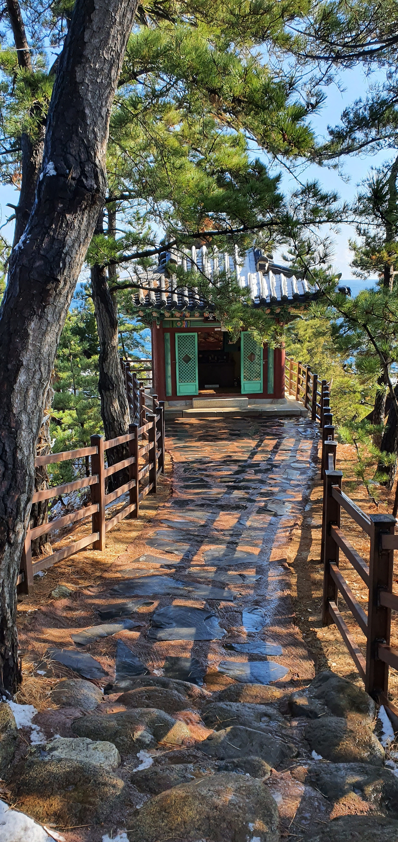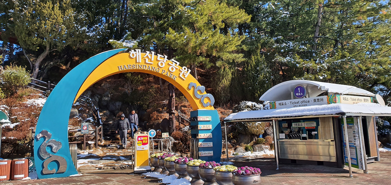 노곡항의 앞바다가 가까이 보이는 노곡 삼거리에 도착했을 즈음 햇볕이 점점 강해지고 있었다. 장소에 따라 다르게 녹는 눈은 거리에 멋들어진 눈의 나라를 만들어 주었다. 한참을 눈에 감싸인 숲과 나무에 감탄사를 쏟아내며 걸었다. 이런 것이 '길섶에서 주은 행복'이지 않을까. 한 시간 정도 눈이 펼쳐놓은 겨울왕국의 세계를 감상하며 걷다 보니 저기 수로부인 헌화공원을 오르는 엘리베이터 탑이 보인다. 임원항이다.