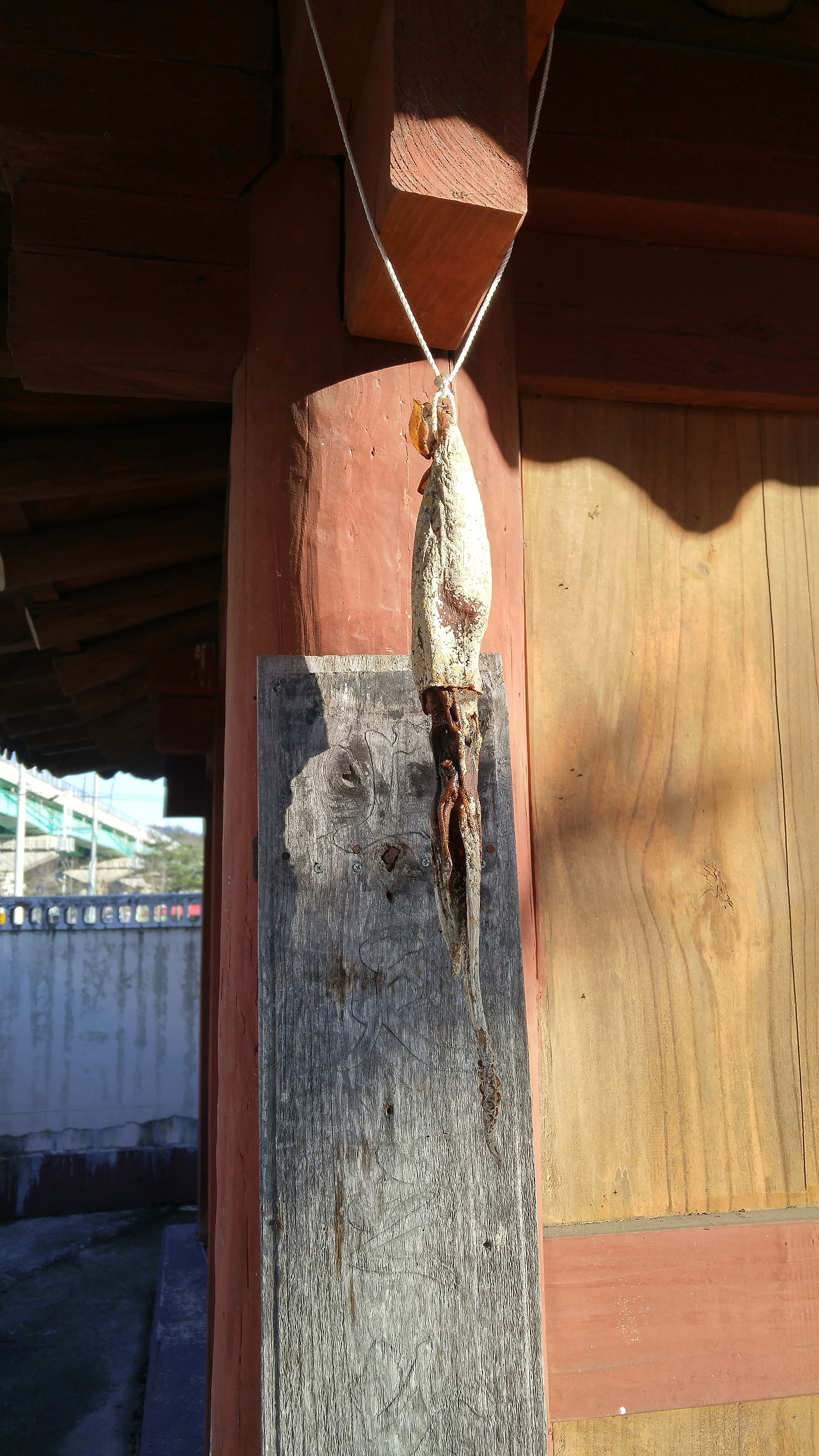 눈 덮인 소나무가 서있는 사이로 서낭당이 보인다. 할배서낭당에 제물로 바친 오징어의 모습