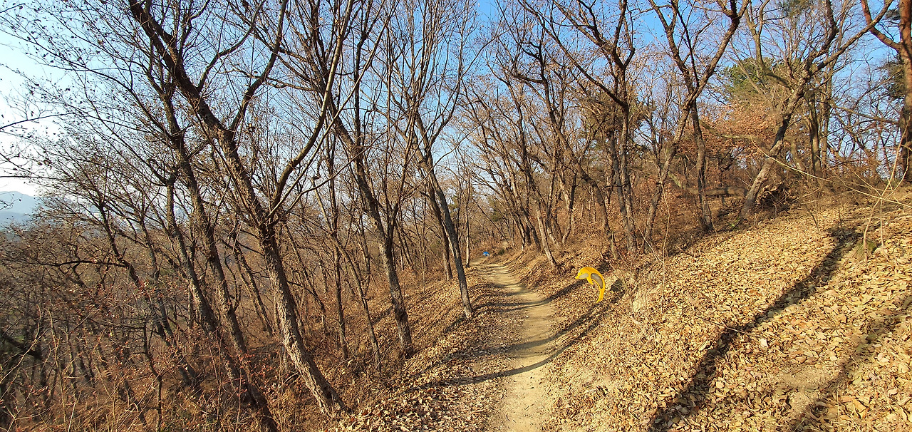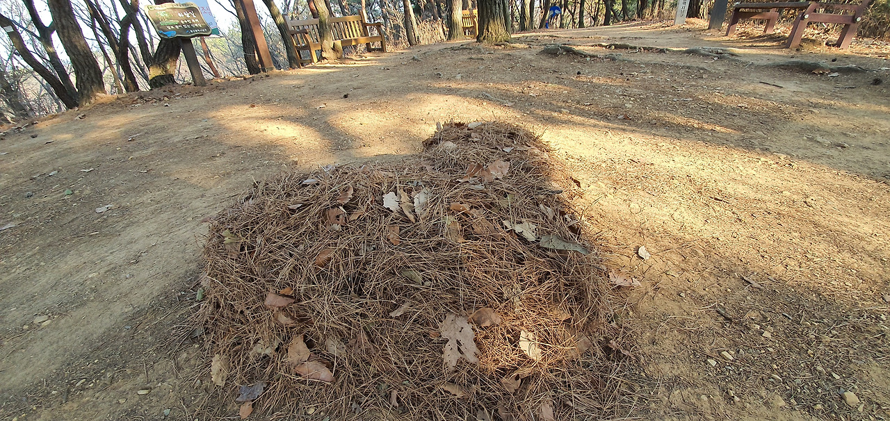 도로를 내기 위해 산의 능선을 횡단한 모습이다. 이런 거면 돈이 좀들어도 터널을 뚫어야 하는거 아닐까? 해발 125.7m의 삼호산으로 가는 중간이 도로에 의해 끊겨 있어 다리를 건넌다. 다리를 건너니 '솔마루 산성'이라고 현판을 단 문이 나타난다. "음, 이걸 어떻게 받아들여야 하지?" '정말 진지하게 산성 문을 복원한 것이라고 봐야 하나? 아니면 탐방로에 설치해 놓은 조성물인가?' 정말이지 그게 그렇다. 누군가 길 위에 쌓인 솔잎을 쓸어 하트를 만들어 놓았다. 나는 하루에 몇 번이나 사소한 것으로 상대방을 즐겁게 해 주려 노력할까? 도시라는 곳은, 또 먹고 산다는 것은 날카로운 미늘을 달고 상대를 옭아매려 노리는 작업일 뿐인 건가? 절대 그렇지 않을 거라고 믿어 보지만 '사실 발등 찍힌 적도 많다.'