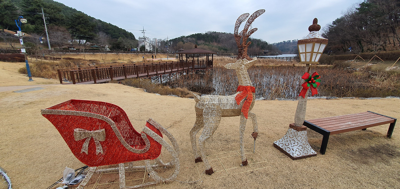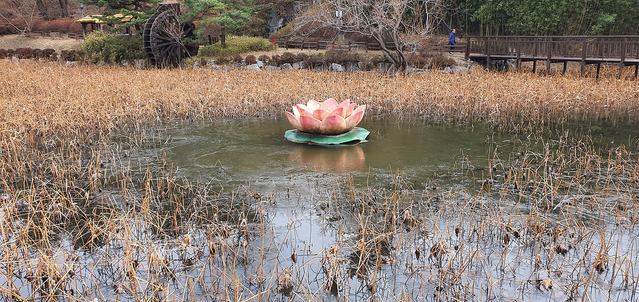 선암호수공원의 입구에는 루돌프와 썰매상이 있다. 그래, 크리스마스야 지났지만 기분까지 끝내버릴 이유는 없다. 비싼 돈을 들여서 시설을 설치했으면 본전을 뽑아야 한다. 연들이 자라는 습지에는 커다란 홍연이 꽃을 벌리고 있다. 가끔은 가짜가 마음을 위로해 주기도 한다. 이곳은 자연습지가 아닌 공원습지다. 공원에서는 생태계의 유지보다는 시민들에게 볼거리를 제공해주고, 쉬어갈 수 있도록 해주는 것이 더 중요하다. 그래도 안내판에는 이곳에 있는 황소개구리에 대해 설명하고 있다. 그런데 황소개구리의 피해는 과거에 비해 훨씬 줄어들지 않았나? 그들은 이제 우리의 자연생태계의 한 축에 자리를 잡고 살아가고 있으므로 이들에 대한 감시는 계속하되 관리대책은 한 걸음 더 나아간 방식으로 해보는 건 어떨까.