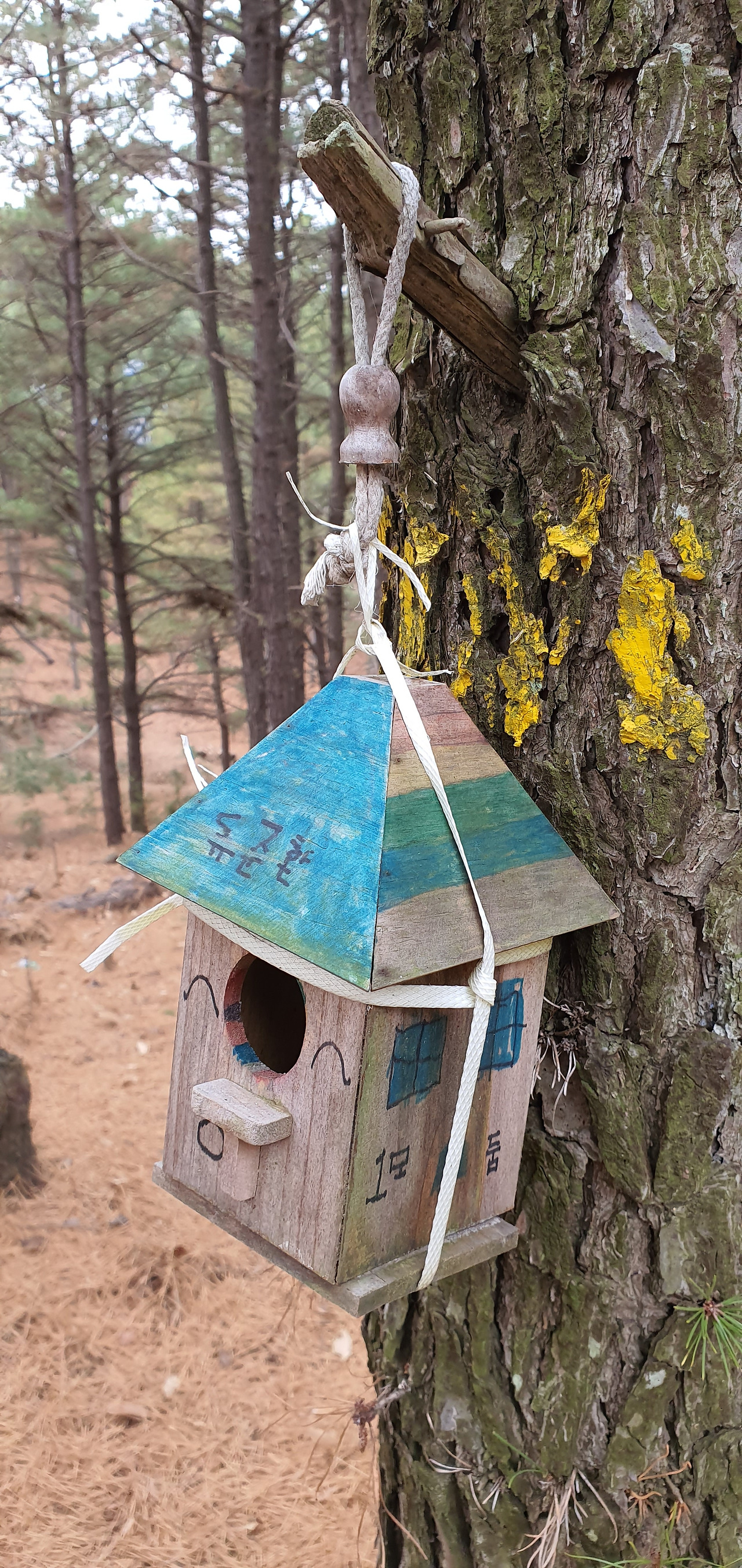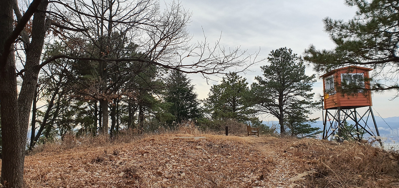 함월산 정상부에 있는 산불감시초소(좌)와 선암공원으로 내려가는 길에 있는 리기다소나무 식재림 누군가 리기다소나무 줄기에 새집을 달아 놓았다(좌). 스트로보잣나무숲의 낙엽이 쌓인 길은 부드러운 푹신함이 있다(우)