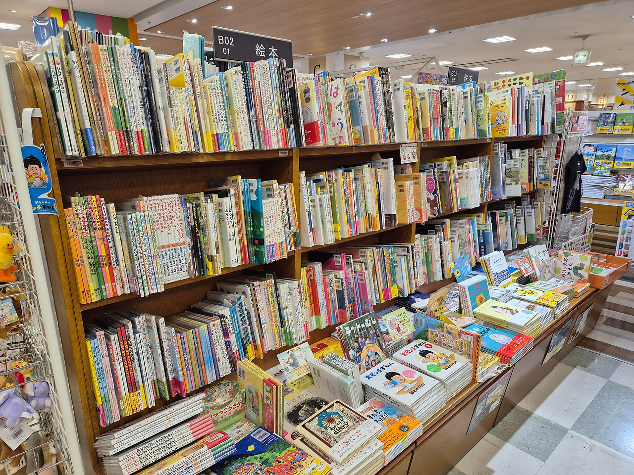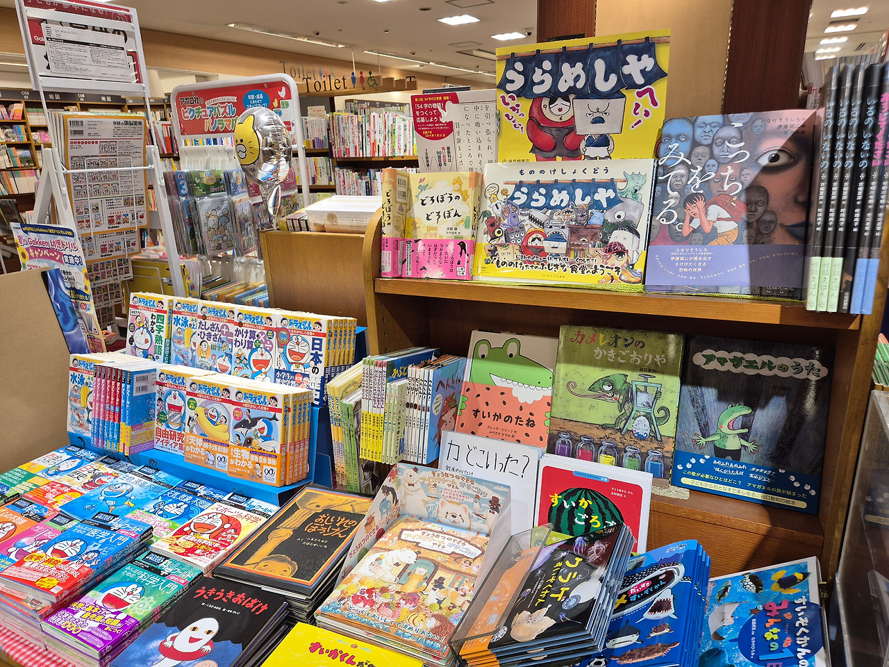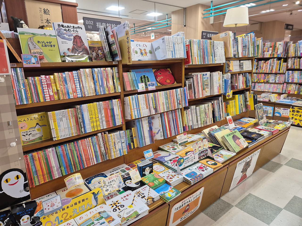 우연히 눈에 띈 도라에몽 현수막을 보고 이 쪽에 어린이책이 많겠다 싶었는데, 정답. 서점 왼쪽 한 구석에 그림책을 포함한 다양한 어린이책이 나를 기다리고 있었다. 책꽂이의 가로길이만 봐도 마루젠 서점에 비해서는 규모가 크지 않다는 것을 알 수 있었다.