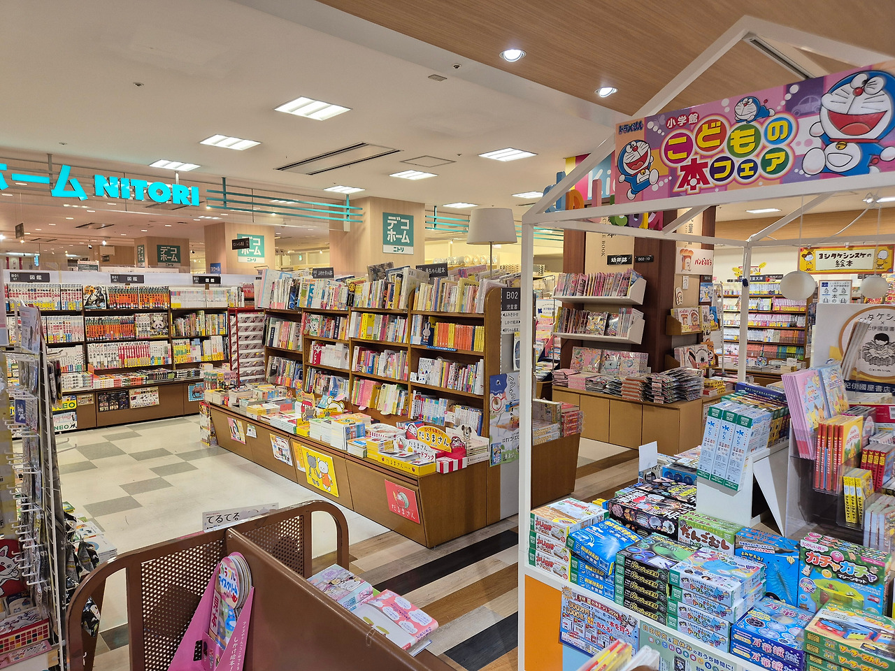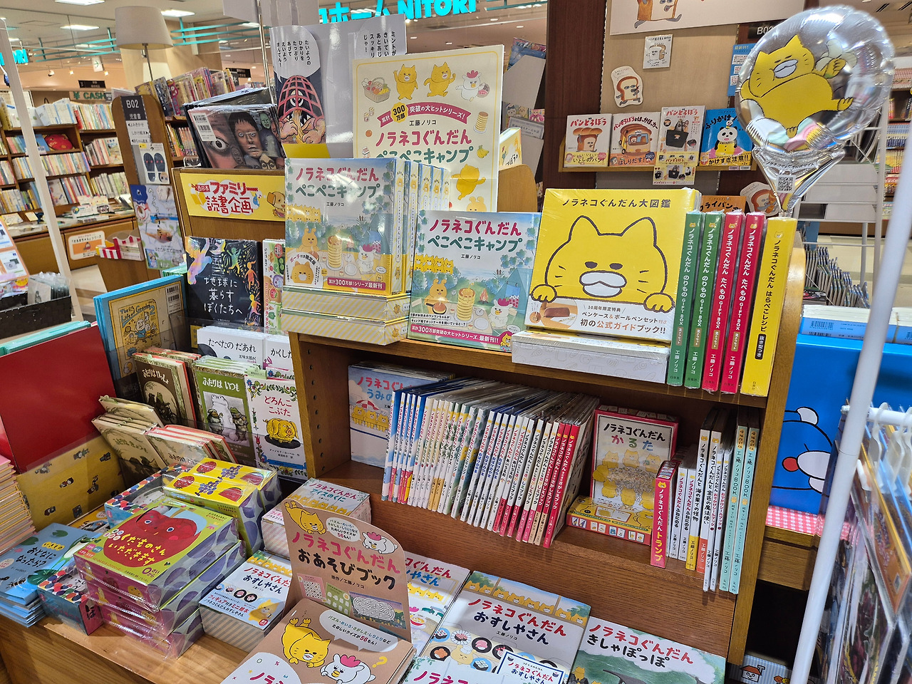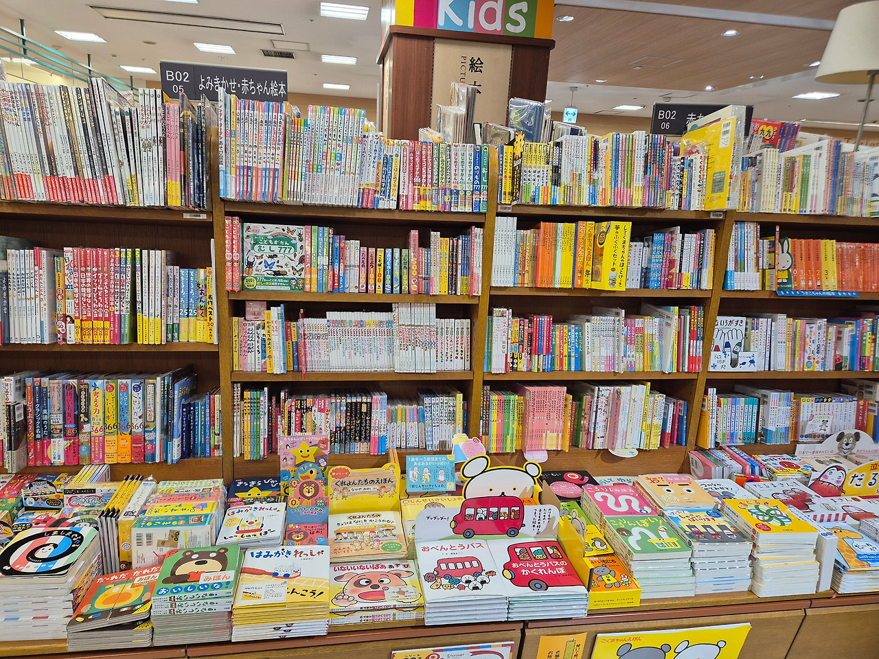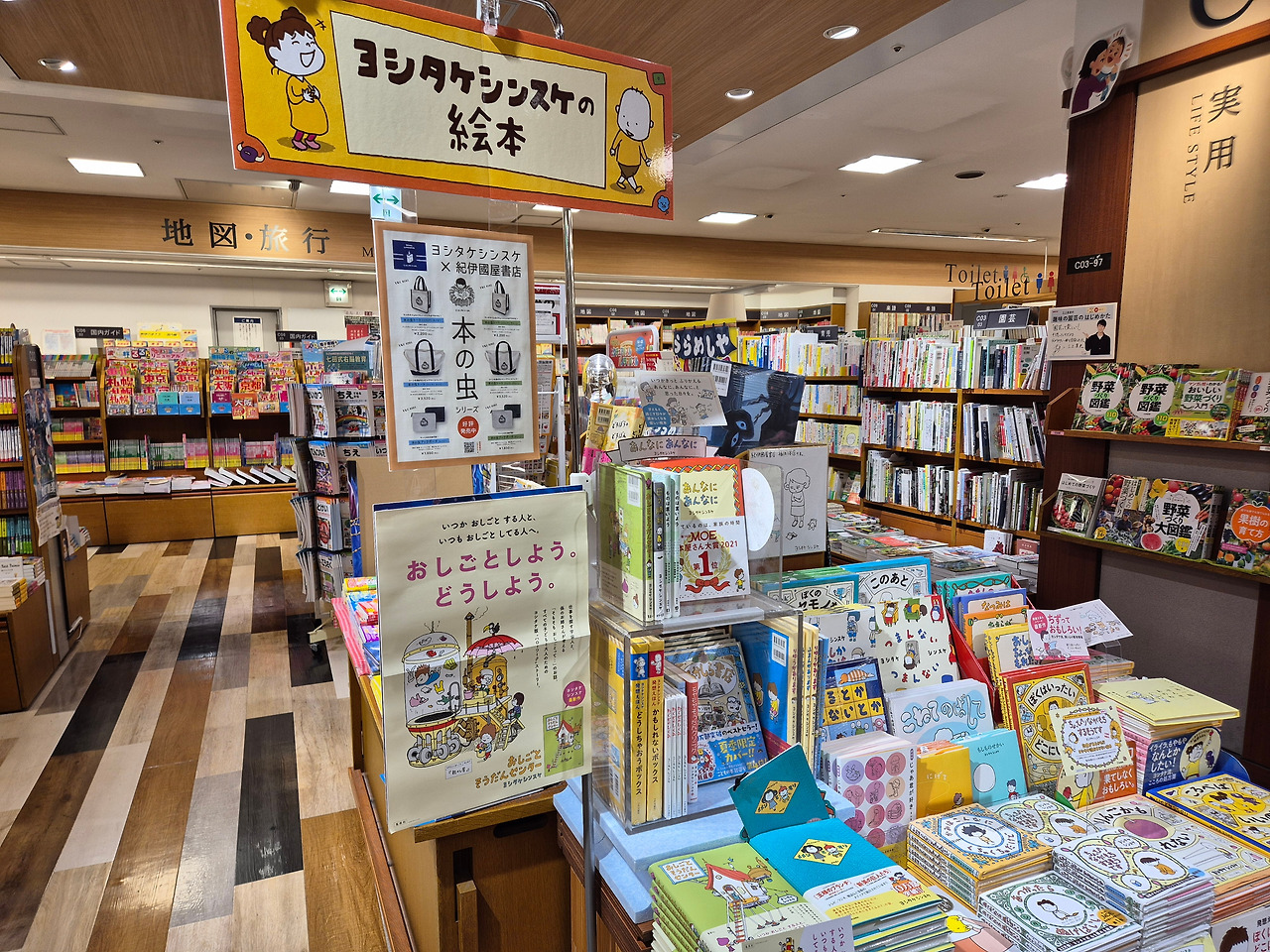 우연히 눈에 띈 도라에몽 현수막을 보고 이 쪽에 어린이책이 많겠다 싶었는데, 정답. 서점 왼쪽 한 구석에 그림책을 포함한 다양한 어린이책이 나를 기다리고 있었다. 책꽂이의 가로길이만 봐도 마루젠 서점에 비해서는 규모가 크지 않다는 것을 알 수 있었다.