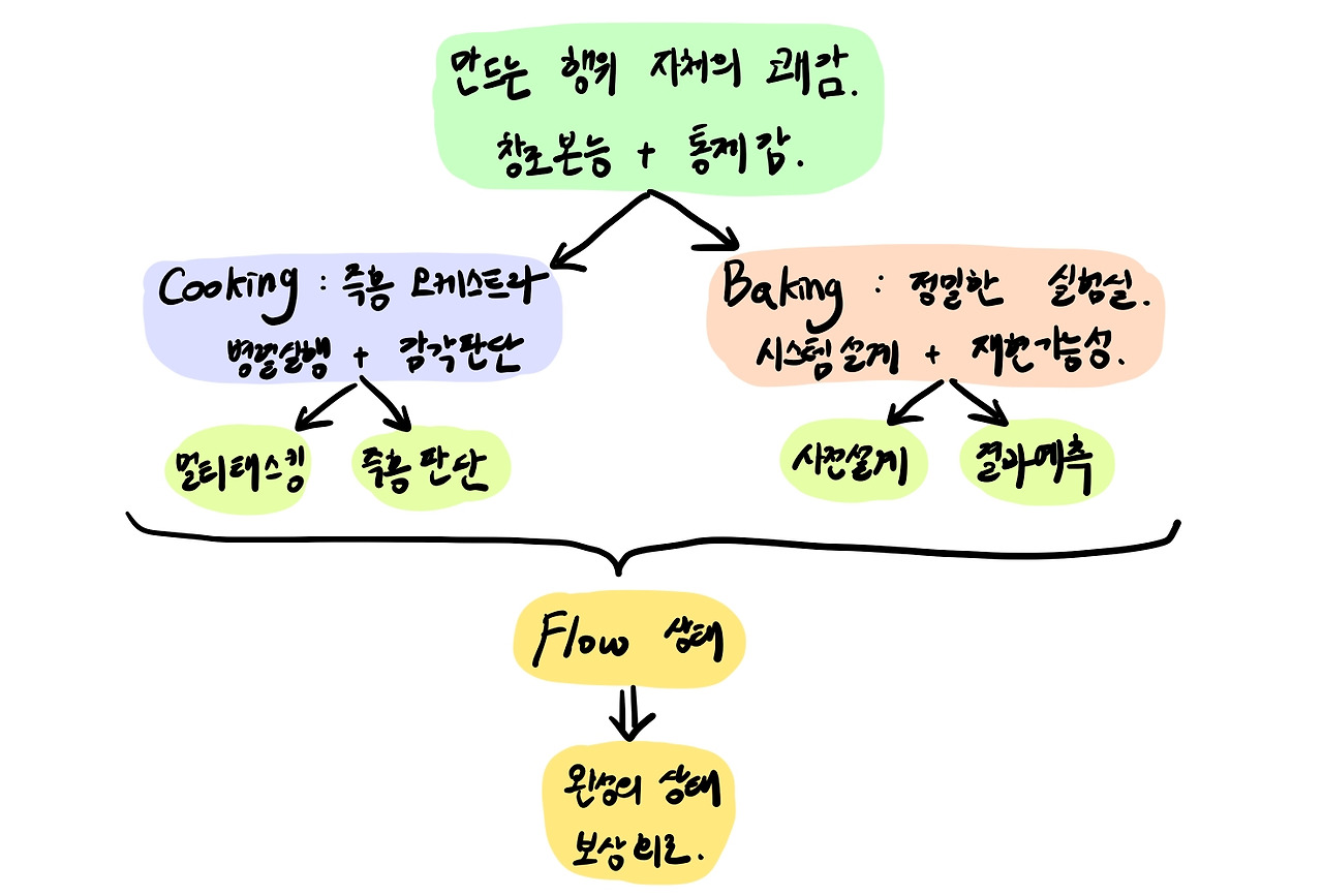 요리가 즉흥적인 변수와 리듬을 즐기는 재즈라면, 베이킹은 엄격한 형식미와 규칙 속에 답이 정해져 있는 클래식 교향곡에 가깝다고 볼 수 있다. 엄연히 다른 장르이다.