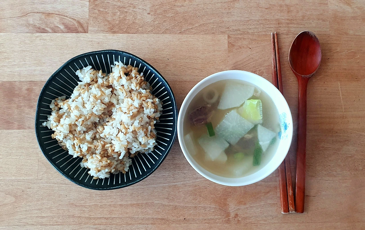 오늘의 한끼는 귀리밥과 소고기 무국이다. 제철인 무를 넣은 무국은 가을과 겨울에 먹기 좋은 음식이다. 액젓과 새우젓으로 간을 한 소고기 무국은 두 그릇을 먹어도 살찔 걱정을 하지 않아도 된다. 귀리를 섞어 지은 밥은 식감과 포만감뿐 아니라 영양도 풍부하다고 알려져 있다. 특히 혈당수치를 천천히 올려준다고 해서 꾸준히 먹고 있다. 탄수화물을 너무 적게 먹으면 오후에 에너지가 딸리고 저녁 공복을 참기가 더 힘들어지기때문에 1일1식을 할때 탄수화물을 지나치게 제한하고 있지 않다. 대신 탄수화물을 먹는 순서를 채소-단백질-탄수화물 순으로 되도록이면 나중에 먹으려고 노력하고, 정제된 탄수화물이 아닌 좋은 탄수화물을 먹으려고 애쓴다.