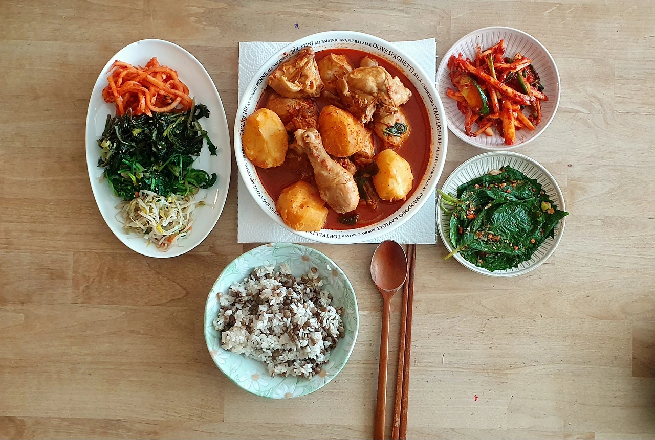 오늘의 한 끼는 렌틸콩밥과 설탕대체제인 알룰로스를 넣은 닭볶음탕과 여러 나물 반찬이다. 닭볶음탕은 아이들이 좋아해서 자주 해 먹는 음식이고, 나물은 내가 좋아한다. 그런데 나물하고 밥만 먹으면 금방 소화가 되어 식욕조절이 잘 안 된다. 탄수화물을 더 많이 먹었을 때는 금방 배가 꺼지고 식곤증이 심해 지방과 단백질을 탄수화물을 먹는 만큼 먹으려고 노력한다. 어떤 정해진 양을 먹기보다는 그날그날 배가 부르다는 신호가 올 때까지 충분히 먹는다. 나에게는 특히 '충분하다'는 이 느낌을 느끼는 것이 무엇보다 중요하다. 그래야 더 식욕조절이 쉬웠다.