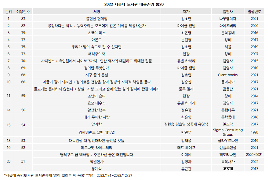 그렇다면 실제 서울대생들은 한해 동안 어떤 책을 주로 읽었을까? 우리나라에서 가장 똑똑한 학생들은 저런 책쯤은 교양으로 읽지 않을까? 그리고 저 책을 읽고 진지하게 학생들끼리 지적인 대화를 나누지 않을까? 그래도 '서울대 학생'들인데, 혹시 저 목록이 진짜 '서울대생들이 가장 많이 읽는 책'이지 않을까?