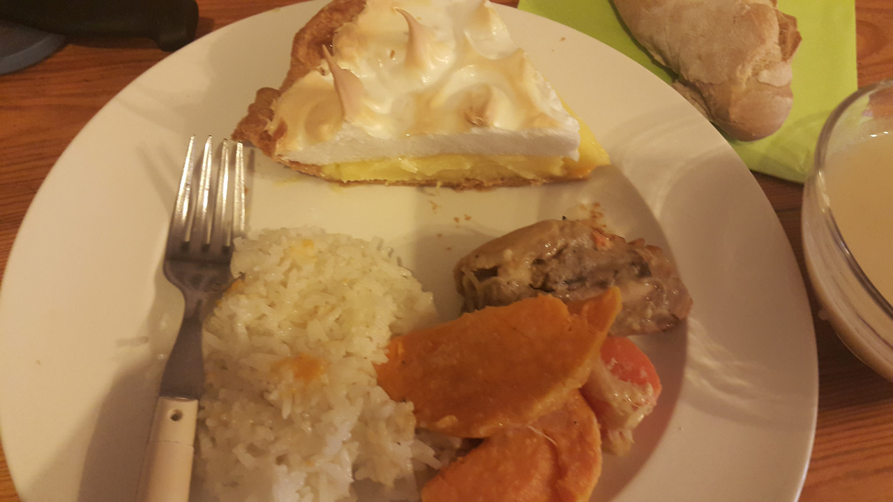 따끈한 야채 스프와 함께 접시 위에 밥과 치킨 그리고 레몬케이크가 놓여 있었다. 먹음직스러웠다.