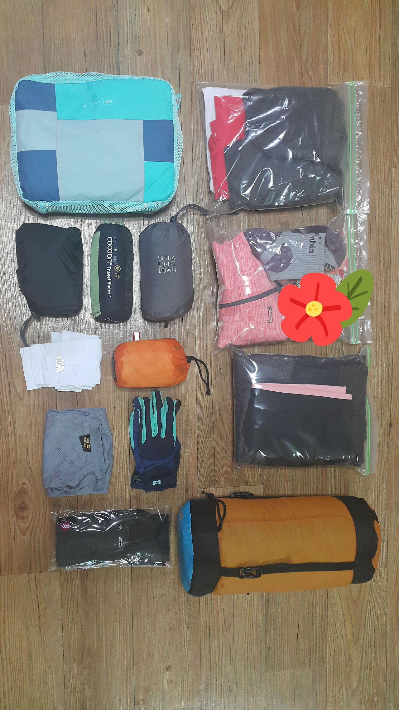 세탁 후 가지런히 개켜서 숙소 테이블 한편에 두었다.