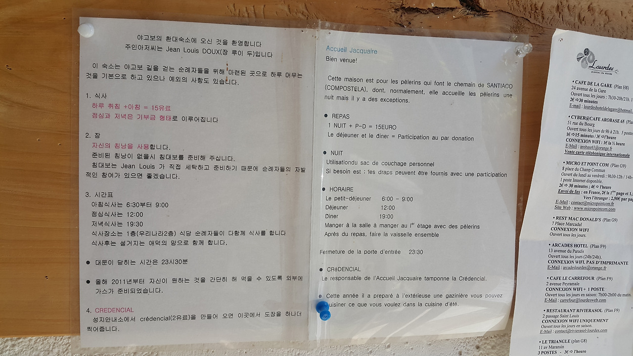 아저씨가 물으셨다. 혹시 한국사람이세요? 네. 어떻게 아셨지? 단번에 알아차리신 게 신기해 의아한 눈빛을 보냈다. 내 이마에 한국인이라고 쓰여 있는 것도 아닌데. 촉이 장난이 아니시네. 그러더니 뭔가 가져오신단다. 내게 건네신 건 다름 아닌 숙소 사용 안내문이다. 그런데 이럴 수가! 한국어다. 반가웠다. 남프랑스 아를에서부터 걷기 시작한 지 약 한 달 만에 순례자숙소에서 한국어 안내문을 만난 건 처음이다. 그만큼 이곳을 찾는 한국인이 많다는 걸 짐작할 수 있었다.