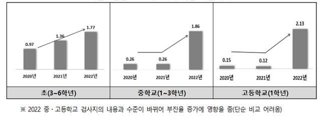 그 결과 2023년 상반기와 하반기. 초등학생의 기초학력 미달 학생 비율은 전체 학생의 1.65%에서 0.68%로 절반이나 감소했고, 중학생의 경우 전체 학생의 2.48%에서 1.4%로 43.27%의 감소세를 기록했으며 고등학생 역시 1.92%에서 0.73%로 줄어 미달률이 61.48% 낮아지는 성과를 보였다. 그러나 일 년의 성과로는 판단하기 어려운 것이 이 기초학력 평가이다. 2022년부터 2024년의 전체 통계를 보면 초등학생 기초학력 미달 추이는 소폭 감소했지만, 중학생·고등학생은 기초학력 보장 정책 추진을 강화해야 하는 상황이었다. 물론 코로나19의 여파와 다문화, 경계선 지능, 난독 등의 학생이 증가한 수치를 감안하면 매년 기초학력 정책 추진의 효과는 분명 나타나고 있다.