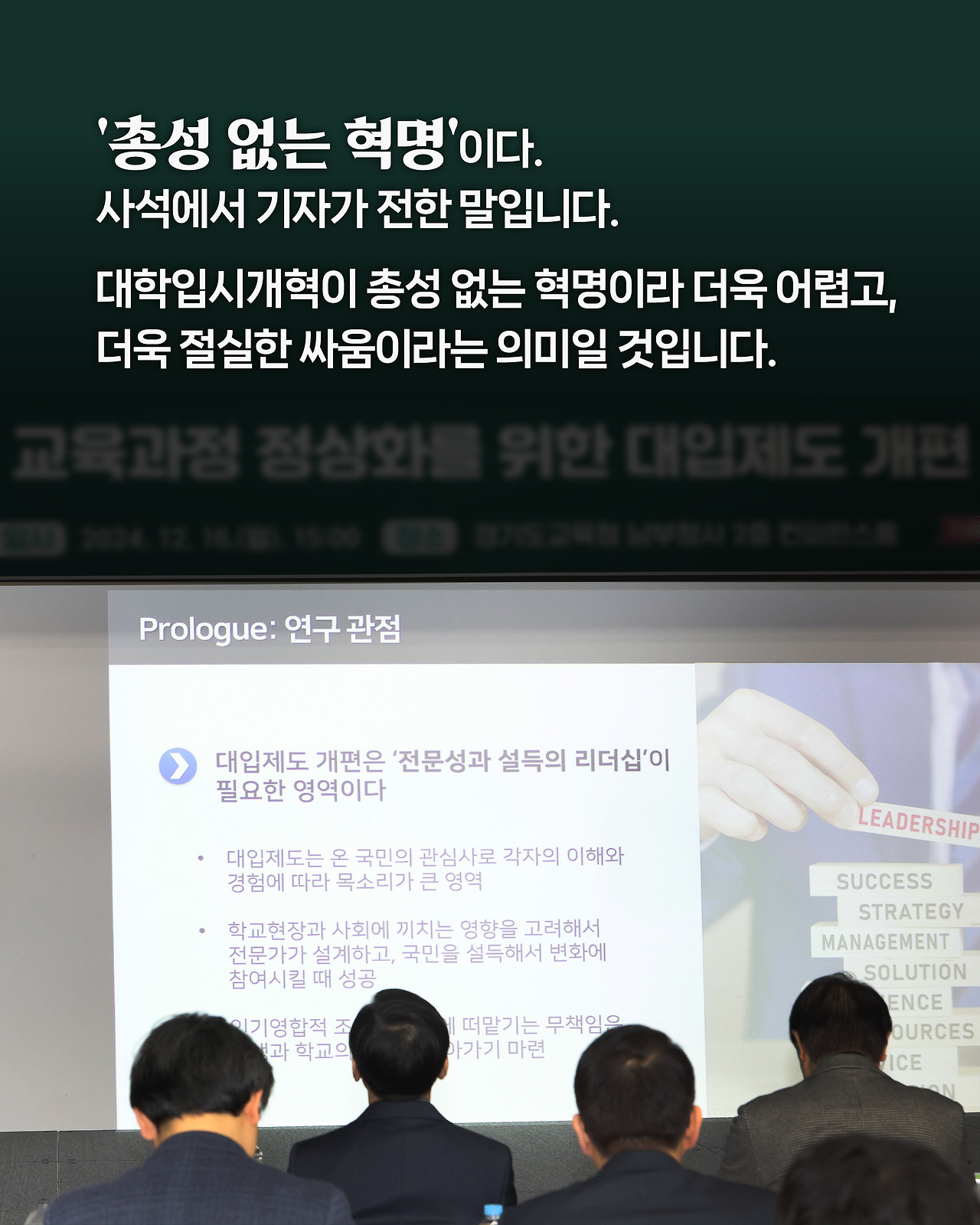 대학입시를 바꿔야 대한민국의 미래를 바꿀 수 있다. 이보다 더 중요하고 절실한 시대 과제가 있을까? 어느 언론인은 " 대학입시를 바꾼다는 것은 대한민국 전체를 바꾸는 것"이라며 "총성 없는 혁명"이라고까지 표현했다. 총성 없는 혁명이라 더욱 어렵고, 더욱 절실한 싸움이라는 의미였다.